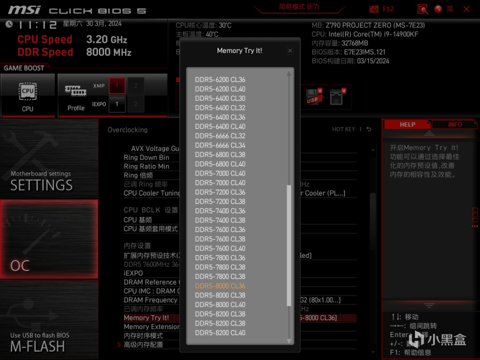 重启进入BIOS界面,在高级设置里,可以进行各种设置,我们做个简单的内存超频。微星主板支持memory try it功能,支持内存一键超频,方便又安全。我们使用这个功能,一键超频到8000MHz。
