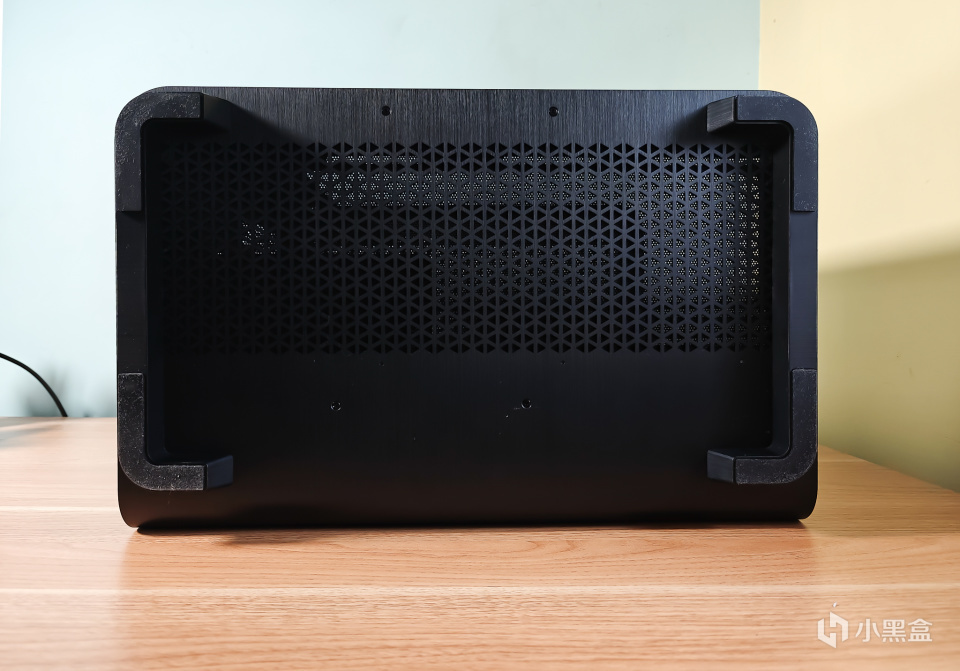 机箱的底部,同样是布满了三角形的通风孔,四个弧形脚,上面是橡胶垫片。