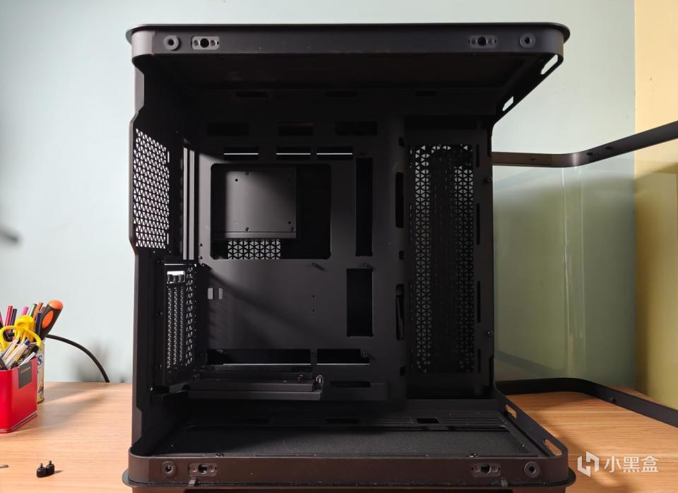 侧面和底部同样有相同的风扇/水冷安装支架,可以取下后安装风扇或者水冷冷排。