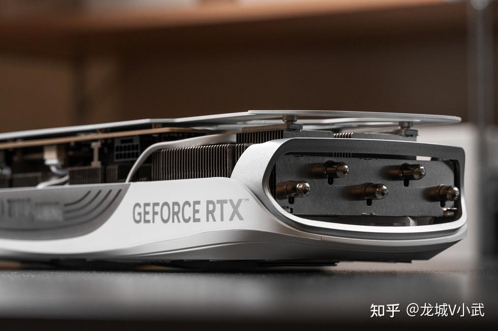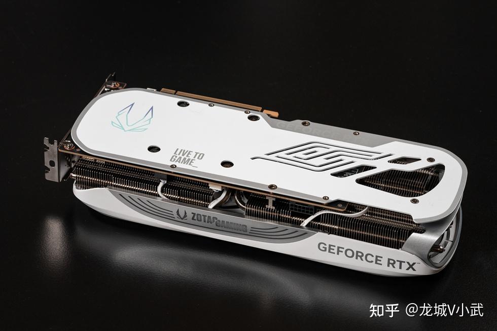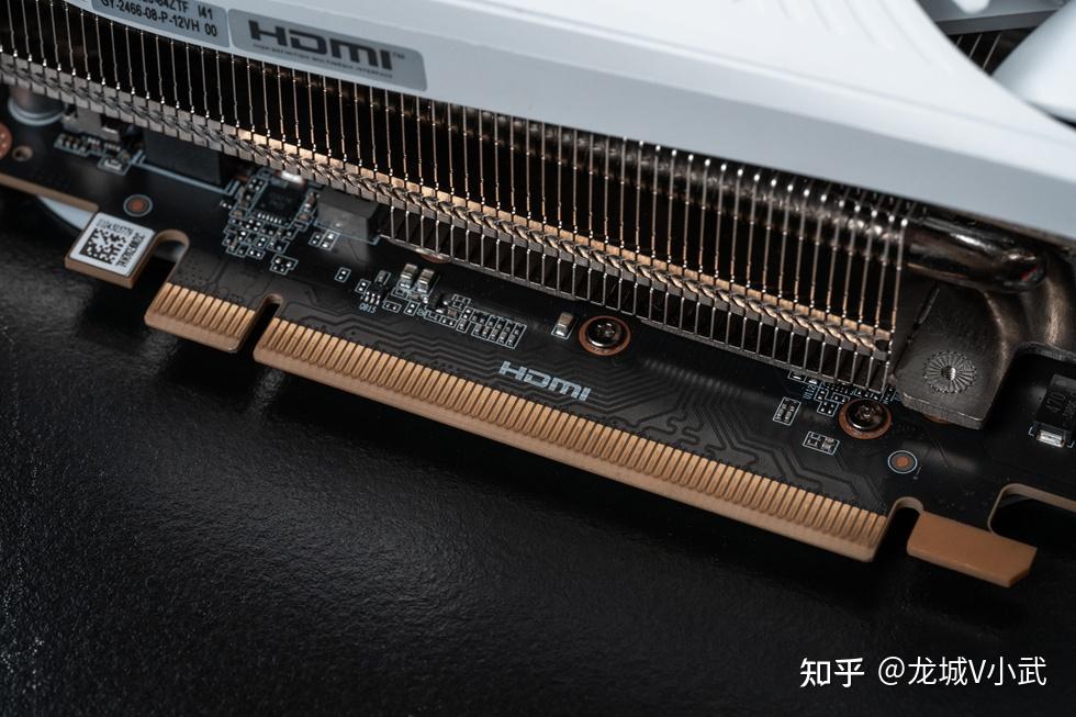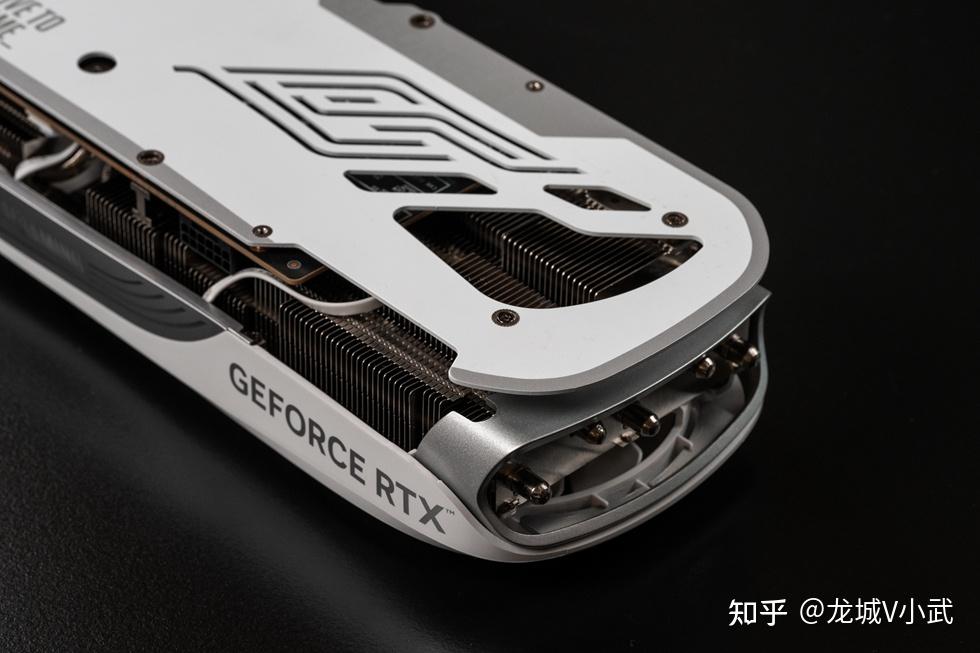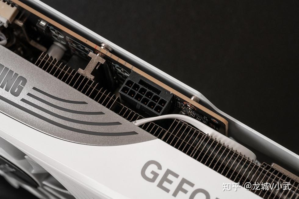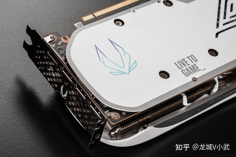 显卡采用全新的 ATX 3.0 标准的16Pin 供电接口。背板部分同样为圆润设计,并增加了合金加固骨骼结构,确保 PCB 均匀受力。背板左侧印有一个很大的图形 Logo,采用渐变设计。背板中间区域加入了拟物风的空气动力学凹陷纹理,右侧是 3个1组的镂空开孔。