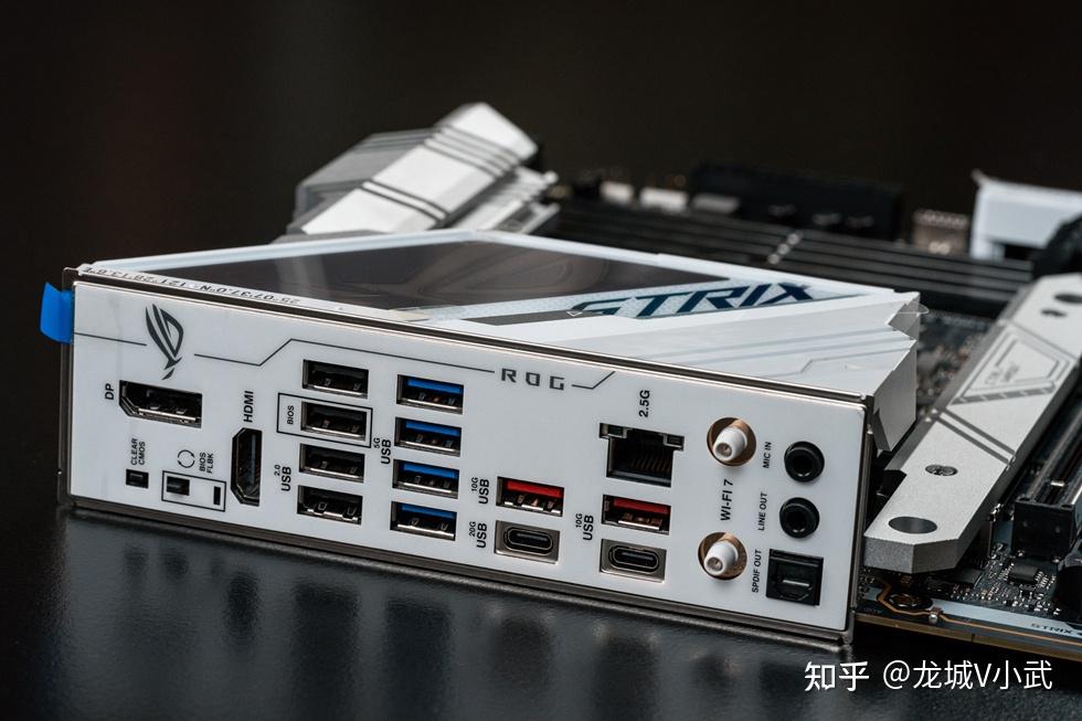 一体式的IO背板已经成为中高端主板的标配,同时做了白化处理。接口方面提供了:接口方面提供了DP/HDMI接口各1个、CMOS清空按钮、BIOS更新按钮、4个USB 2.0接口、4 个 USB 3.2 Gen1 5Gbps Type-A 接口、2个USB 3.2 Gen 2 10Gbps Type-A 接口、1个USB 3.2 Gen 2 Type-C接口、1个USB 3.2 Gen 2x2Type-C接口、2.5G有线网口、还有全新的Wi-Fi 7 易拆卸天线接口以及2个3.5mm+1个S/PDIF光纤输出的音频组合接口。