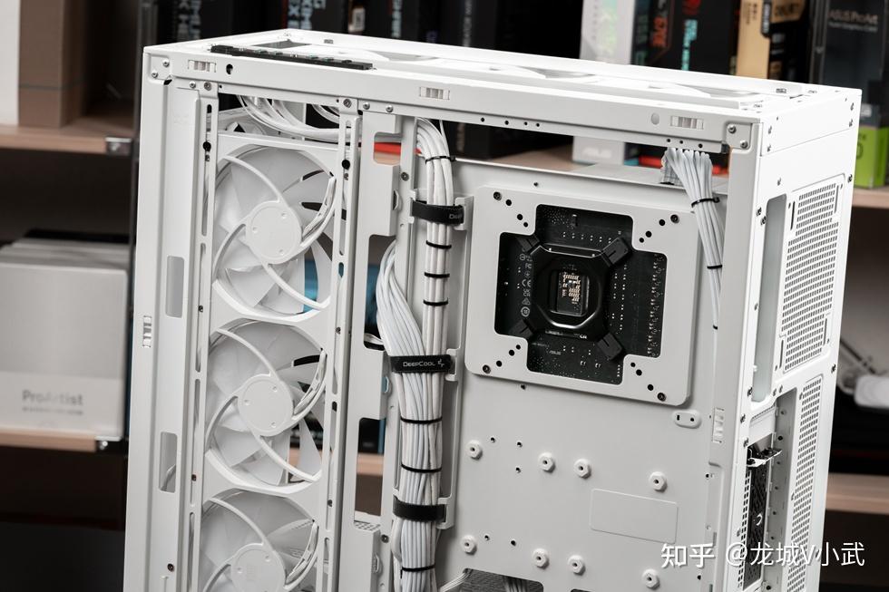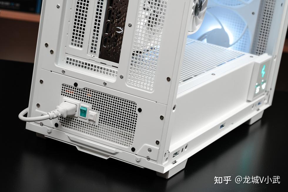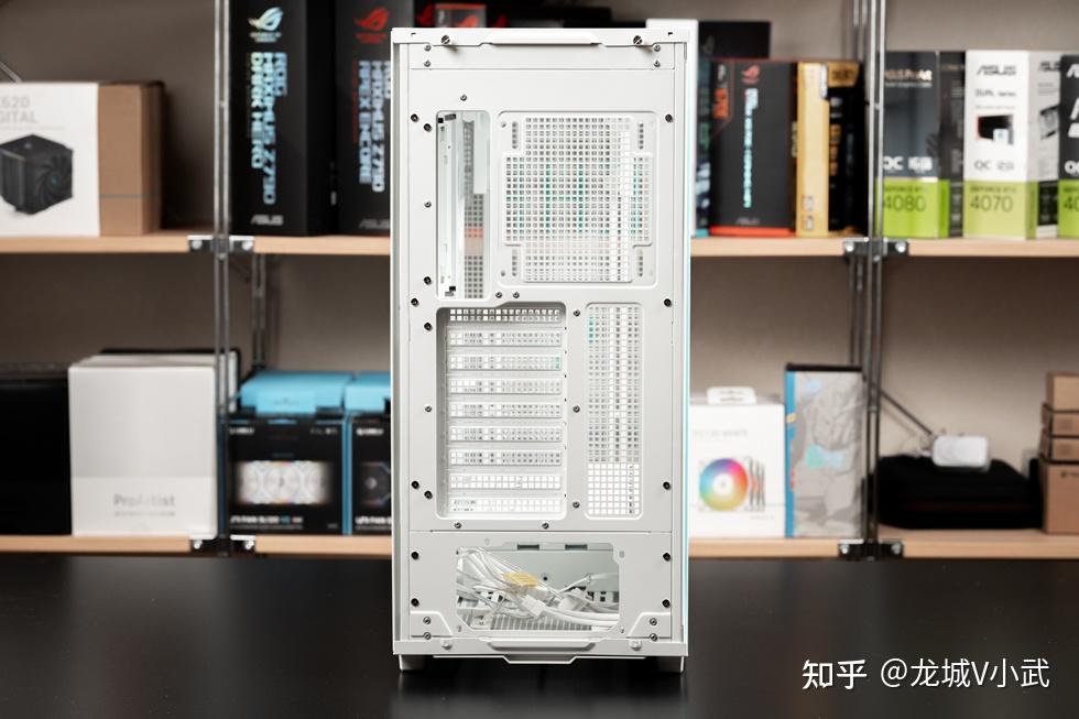 机箱背部,机箱底部左侧为电源和硬盘仓,支持2个3.5寸HDD,右侧为电源安装位,支持最大长度180mm,上方还有2个2.5寸硬盘安装位,机箱背部提供了26mm理线空间,内置理线槽以及魔术贴大幅降低理线难度,让机箱背部走线更加整洁轻松。