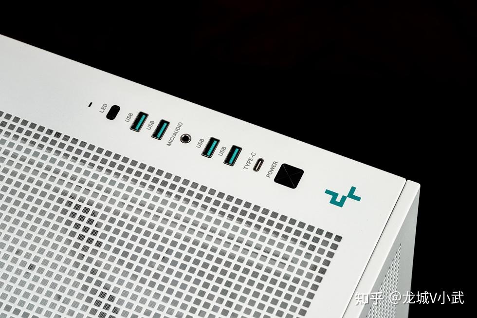 机箱I/O位于机箱顶部右侧,配置有电源开关按键、1个TYPE-C、、4个USB 3.0 Type-A接口以及一个二合一音频插孔。