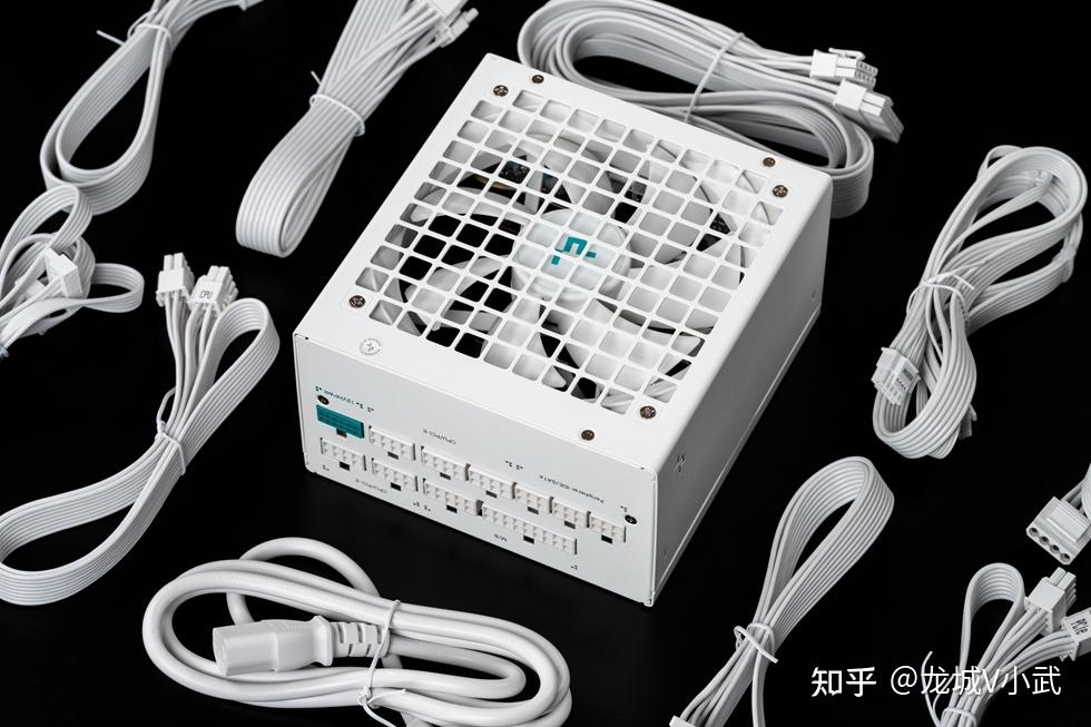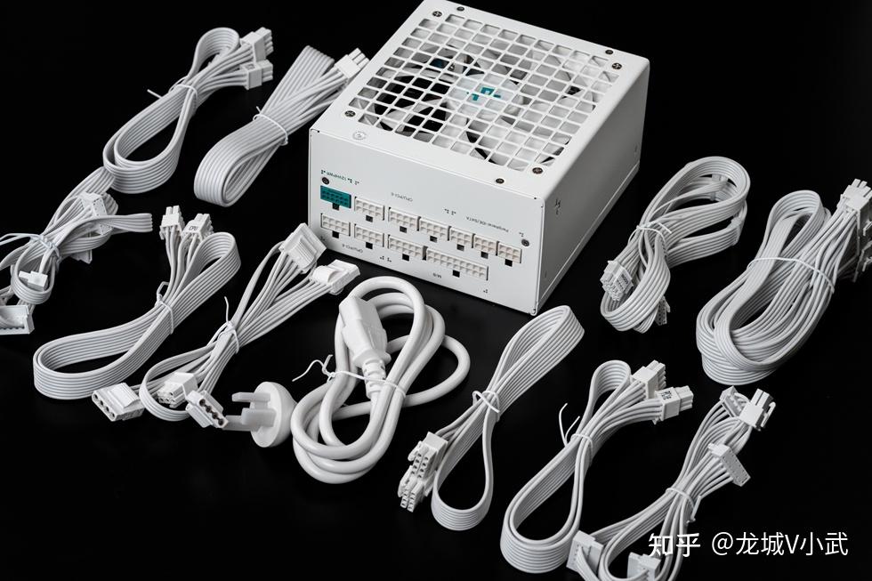 电源整体白色采用全模组接口设计、通过了80PLUS金牌认证,全日系电容(主电容为105°规格)10年质保由侨威代工,官方宣称电源还有6重保护机制,而且在5000米以下海拔的地区也可以正常使用,额定功率为1000W。电源三围尺寸为150mm(宽)x150mm(深)x86mm(高),15CM长度的尺寸装机时有着不错的兼容性。电源模组线材采用白色扁平化排线设计,质感比较柔软。