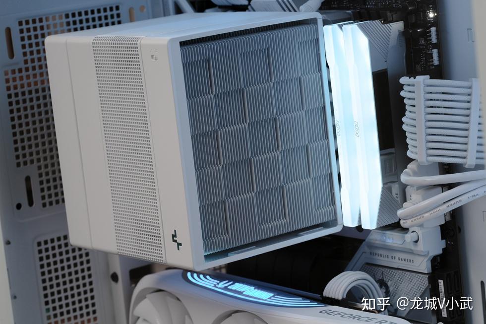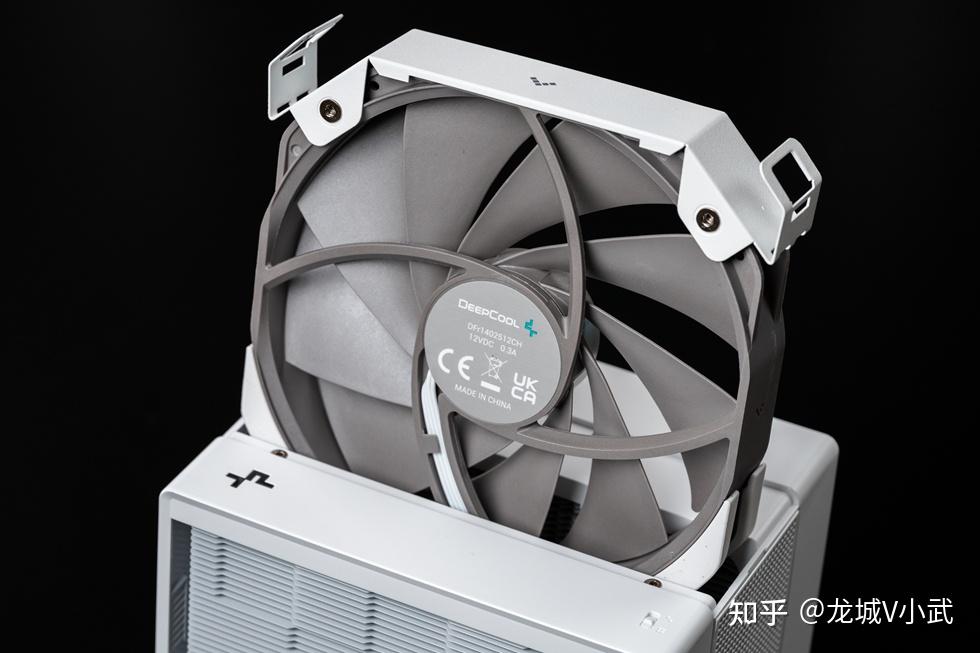阿萨辛4散热器三维尺寸为:144mm*147mm*164mm(WxDxH),重量为1575g。散热器整体白化处理,整体为一个立方体,有着巨大且方正的散热鳍片模组,模组重量较上一代轻 18 %,解热功耗达到了280W。阿萨辛4的风扇采用了一枚140mm正叶外加一枚120mm反叶风扇组合,图中所展示的这面正是120mm反叶风扇这面,上机后要面对的是机箱的后出风口,这样的设计可以完全与内存避让,从而可以兼容不同高度的内存条。