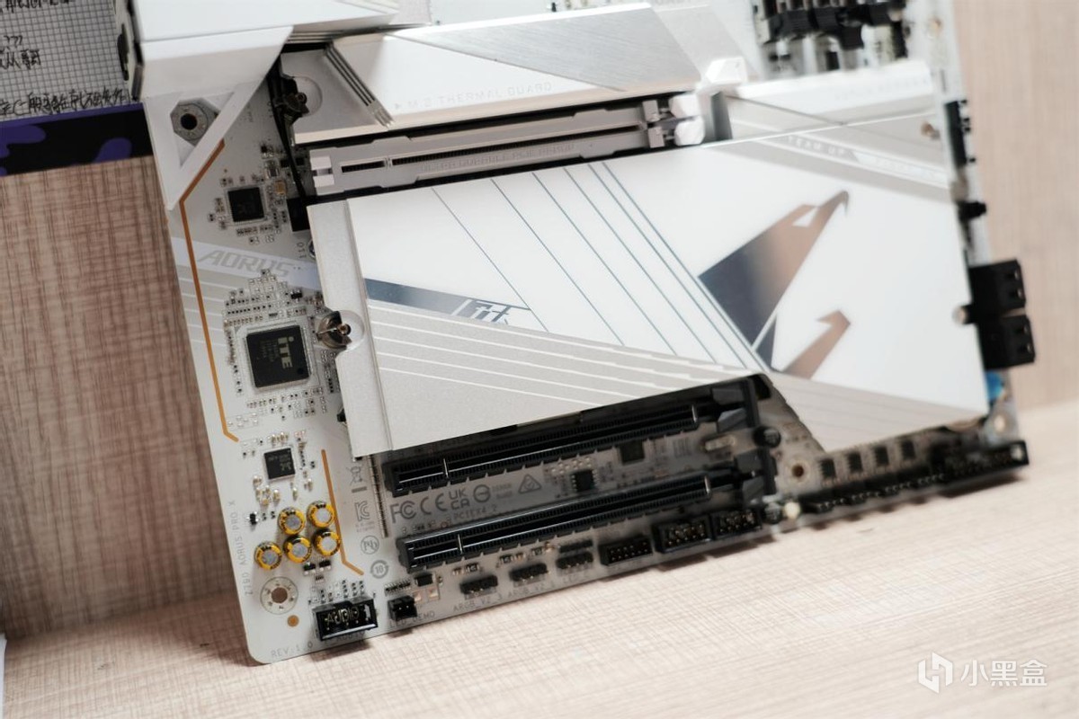 技嘉Z790冰雕X主板在散热设计上也同样出色。除了PCI-E插槽外,所有M.2接口都覆盖了散热装甲,以确保在高速运行时能够有效控制温度,保障硬件的稳定性和性能发挥。上方的散热装甲设计得相当厚实,而下方的装甲则大得出奇,这种设计不仅增强了主板的整体质感,还充分展示了高端主板应有的品质表现。