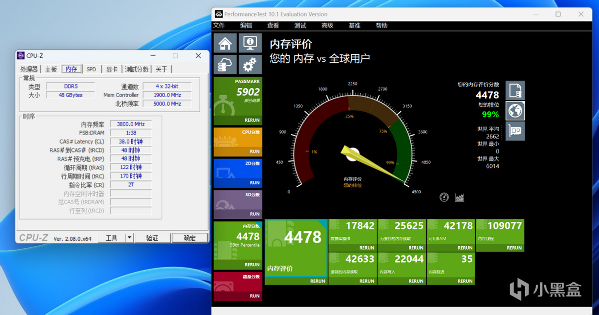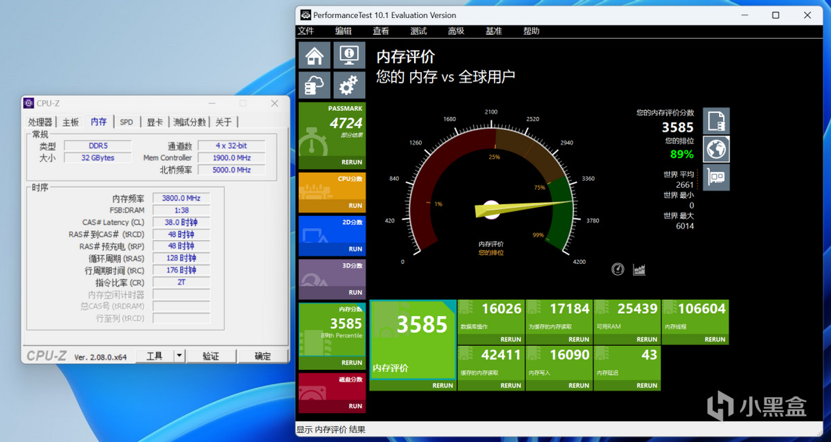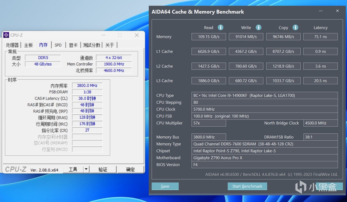 7600MHz,读取速度 109.15GB/s,写入速度 91014MB/s,复制速度96746MB/s,延迟 75.1ns。