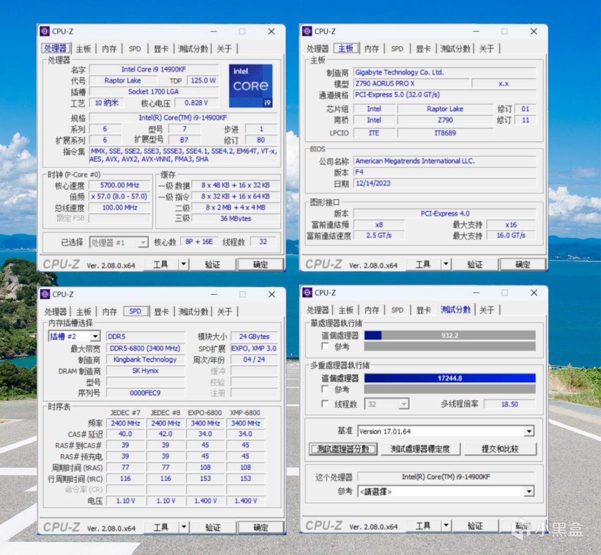 更新完毕进入系统,CPU-Z 的信息读取,处理器是 14900Kf,金百达24*2内存条,频率6800MHz。主板型号为Z790 AORUS PRO X,CPU多核跑分为17244.8,单核为932.2分,性能真顶。