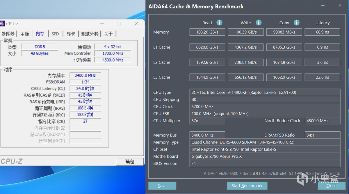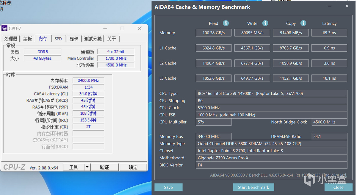 先看看金百达24G*2基本性能,BIOS 开启 XMP 进入系统目前的频率为6800MHz,通过 AIDA64 测试读写性能,此时读取速度 100.38GB/s,写入速度 89095MB/s,复制速度 91498MB/s,延迟 69.3ns。