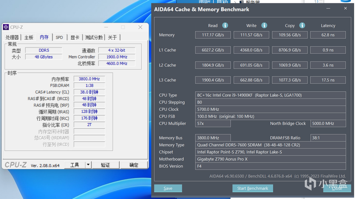 此基础上开启技嘉的“高带宽低延迟”,读取速度 117.17GB/s,写入速度 111.57GB/s,复制速度 109.56GB/s,延迟 62.8ns。