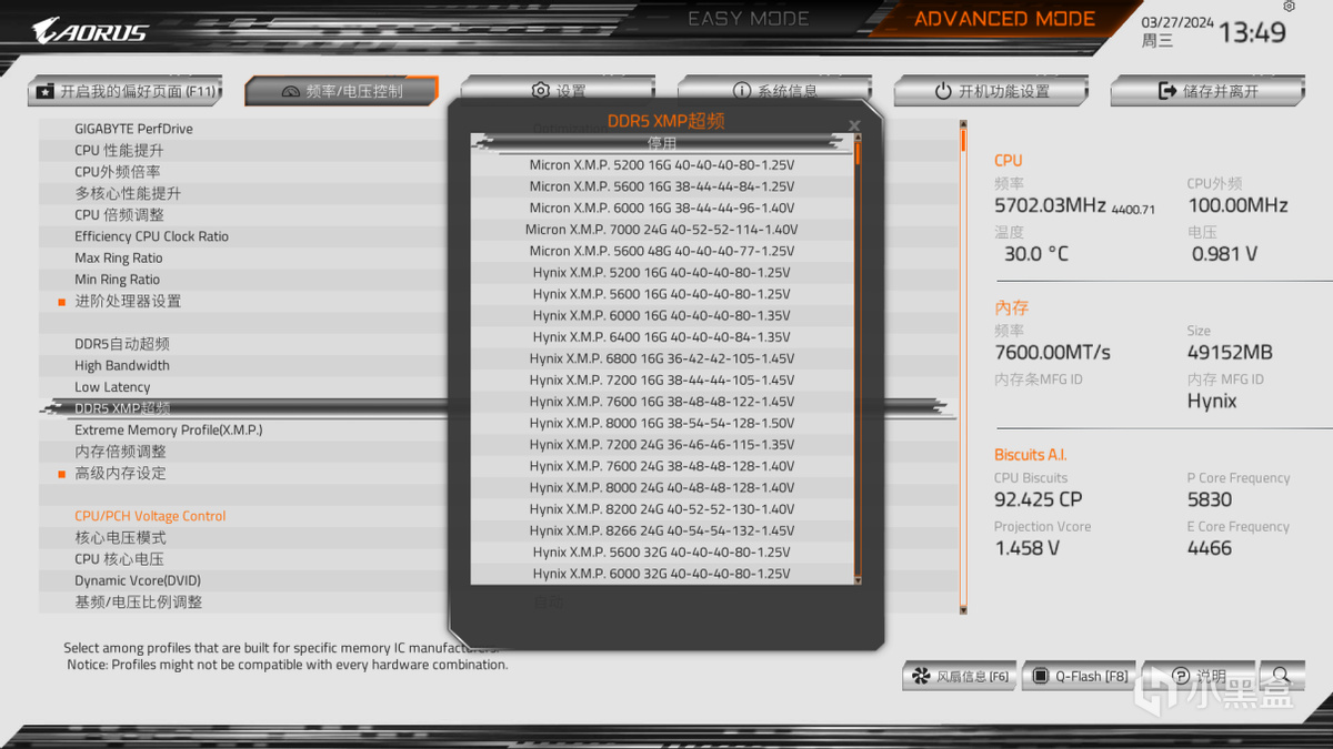 按照惯例,首先进行了BIOS(F5d)的更新。不得不说,Z790冰雕X新版的白色界面设计确实令人眼前一亮,给人一种清新脱俗的感觉。页面布局合理,模式开关集中在右上角,方便用户快速切换;而内存超频选项则位于左下角,一目了然,即使是新手也能迅速上手。