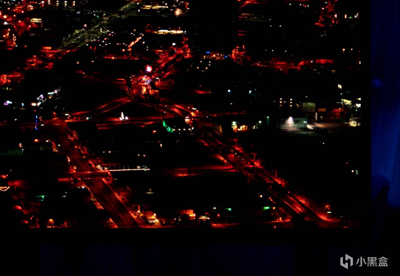 这是夜晚拍摄的画面,视频画面中仅仅只有建筑物上有灯光。而雷鸟U8展现的确实也是仅仅只有发光的建筑物。在其它该黑的画面中,几乎是纯黑,并不是黑的发灰。