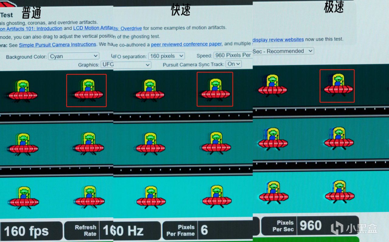 不过在极速档位下,UFO小人边缘则是出现了蓝色的小尾巴,这应该是雷鸟OD加速过猛了,导致出现的过冲overshot鬼影现象。