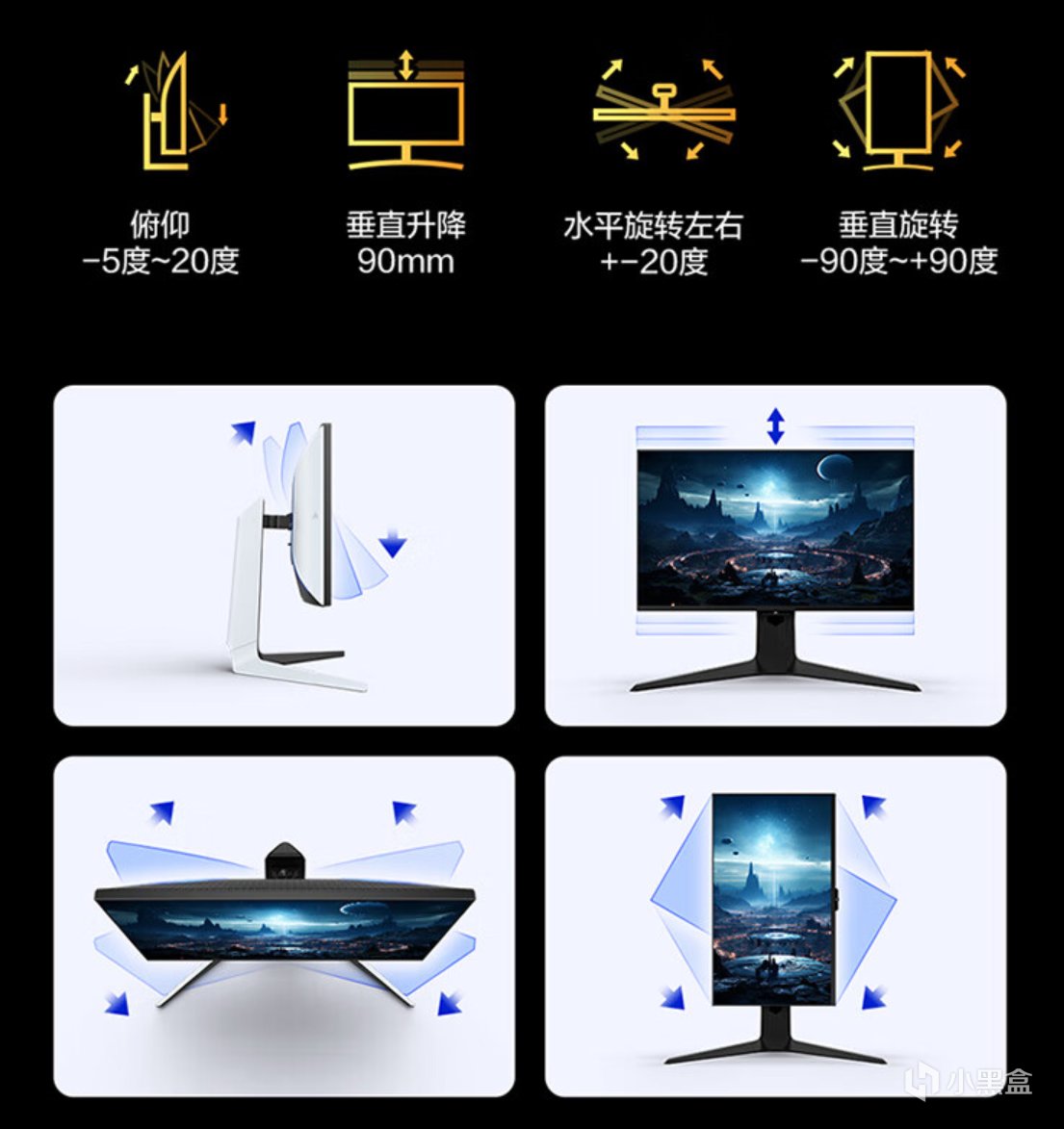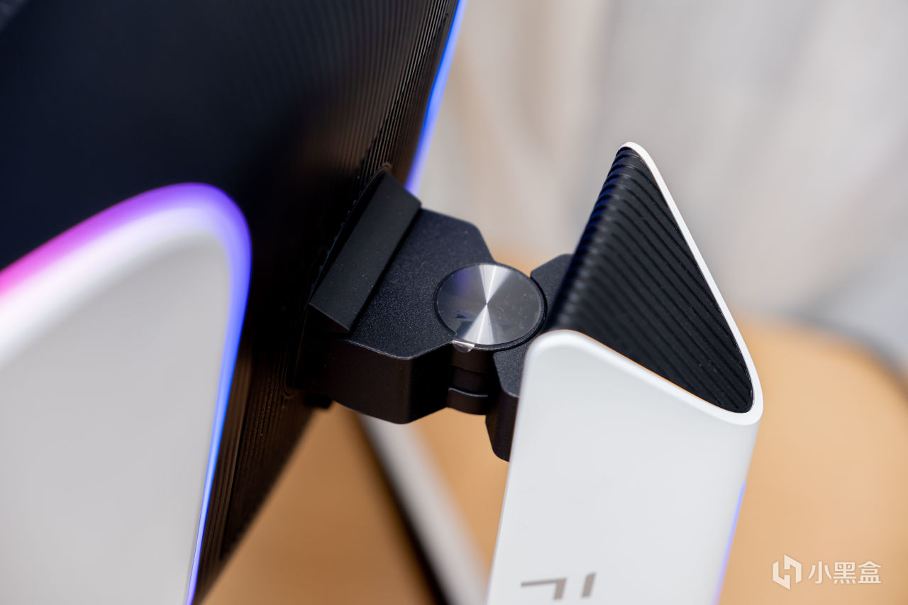 ▼原装支架支持6向调整以及耳机挂钩,支持100*100VESA接口第三方支臂,显示器背部装饰有氛围灯