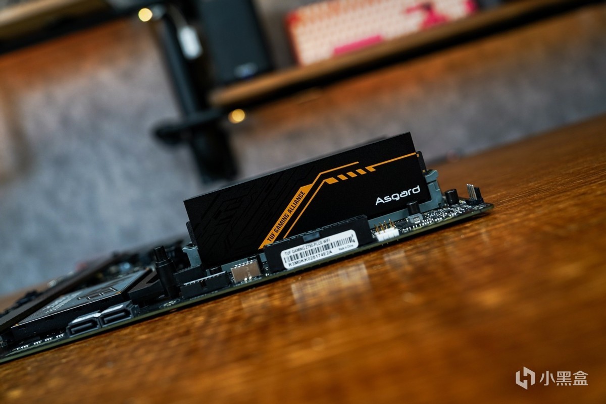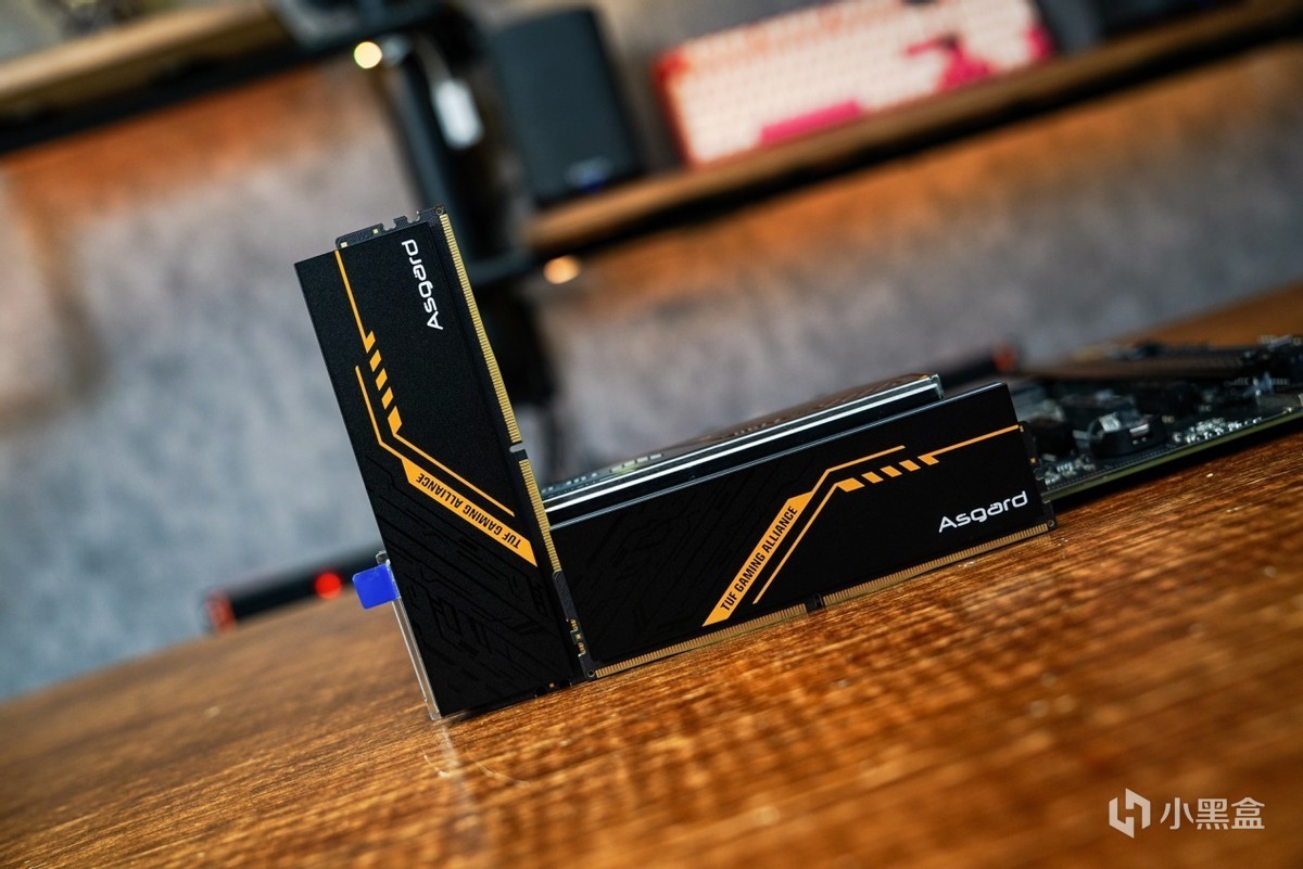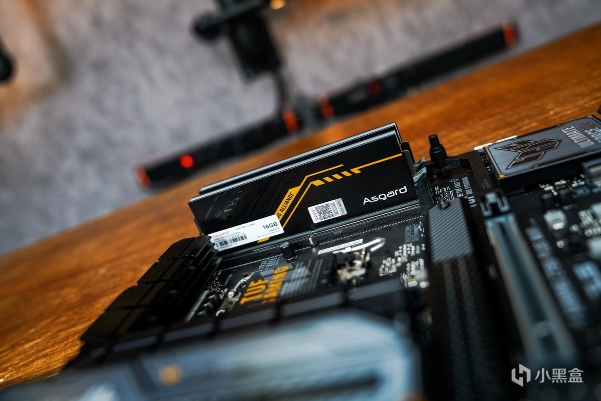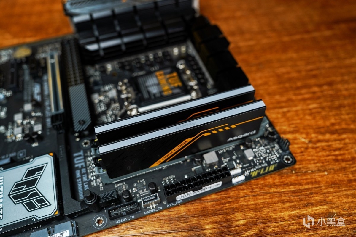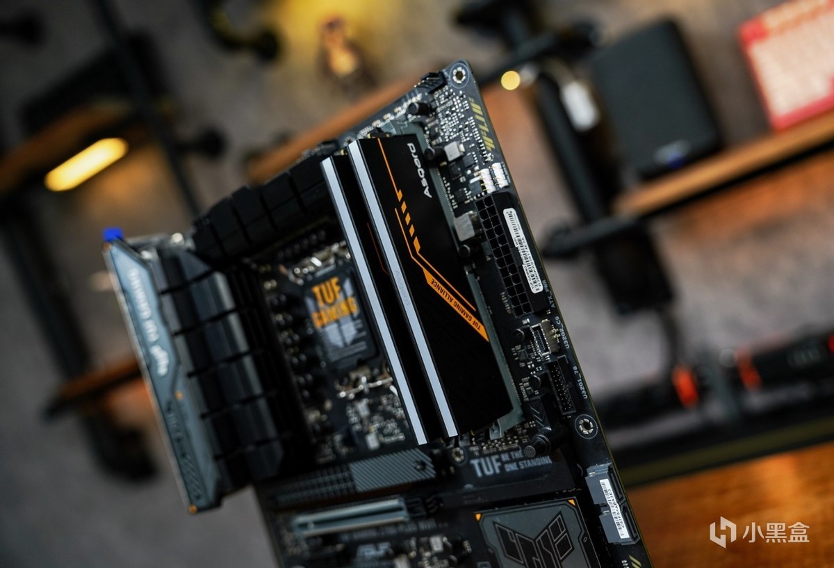 了解完内存的信息之后,再安装进主板看下效果。联名产品的设计语言也是围绕华硕TUF系列来开展的,在配色上2MM厚马甲散热选用和TUF一样的黑橙配色设计搭配上类似华硕TUF电竞图纹元素,两者高度契合的设计语言让内存与主板之间突显出搭配起来相得益彰。