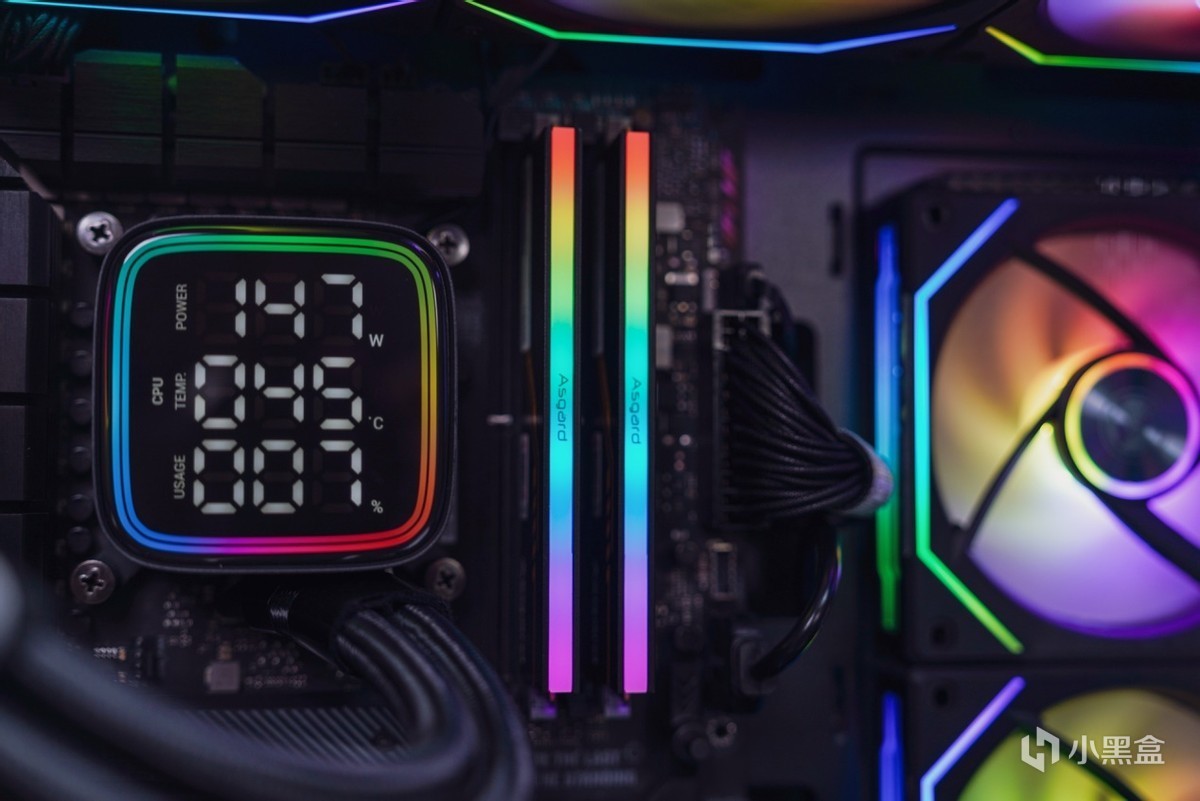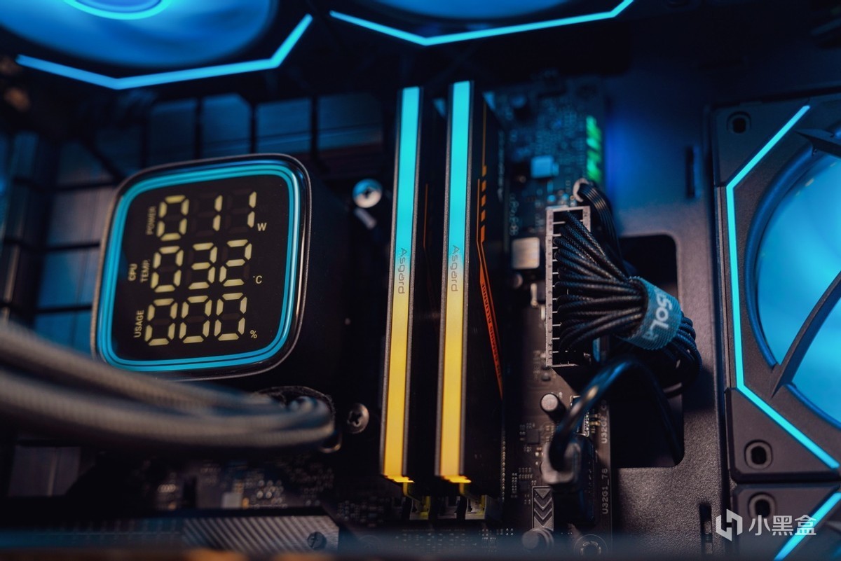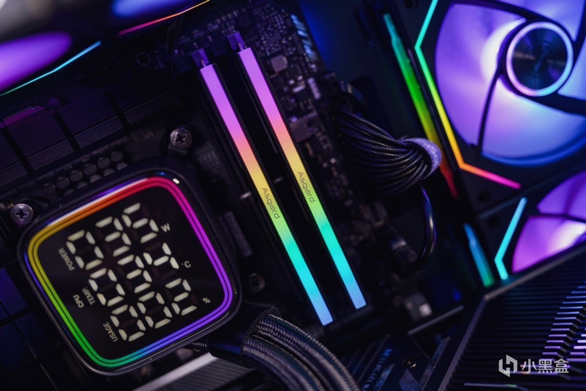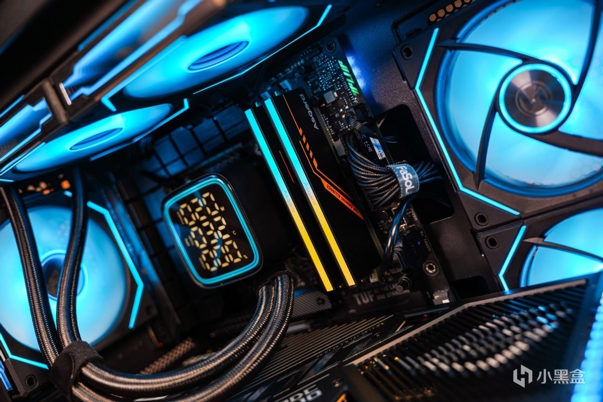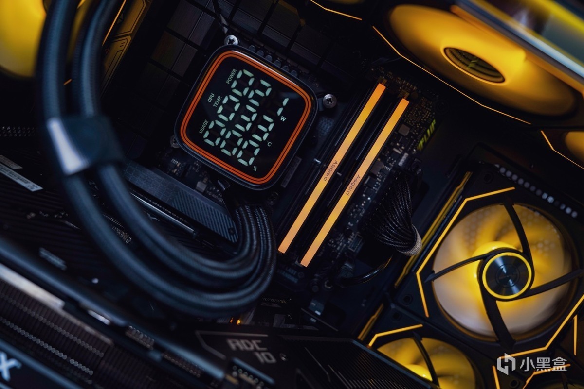 了解完内存的信息之后,再安装进主板看下效果。联名产品的设计语言也是围绕华硕TUF系列来开展的,在配色上2MM厚马甲散热选用和TUF一样的黑橙配色设计搭配上类似华硕TUF电竞图纹元素,两者高度契合的设计语言让内存与主板之间突显出搭配起来相得益彰。