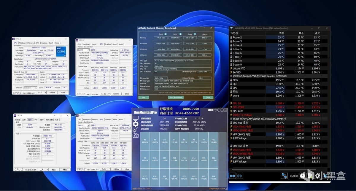这套内存的默认基础频率为5600MH/s,XMP频率为6400MH/s,这里必须要提下DDR5的甜品级频率:6400 MHz和7200MHz,这次使用的TUF Z790 PLUS主板因为受到主板性能的限制,板载预设的最高XMP频率为7200MH,但是XMP超频会受到主板已经预设好的模式下进行,想提升到比如8000以上的频率可能性不大,测试时,经过2-3天的摸索这张主板只能稳定在7200和7600这2个高频段,再想往上提升是做不到了。下面是手动设置超频后从官超的6400MH拔高到7200MH和7600MH,通过软件可看到读取/复制/延迟等实测参数,延迟分别可降低到54.9ns/51.5ns。