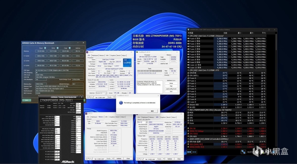 毕竟考虑到海力士的特挑A-DIE可以的超频能力不可能仅仅止步于7000多的频率,看下在其他品牌主板上的超频后的表现,使用同样的处理器和内存搭配上微星最新推出的超频向的Z790MPOWER 主板上这套内存试下冲击到8000MH/s,可以看到通过多款超频软件监控,8000频率也通过了MemTest5的烤机测试,读取性能125.50GB/s,写入性能123.75GB/s,复制性能120.45GB/s,内存延迟49.2ns。