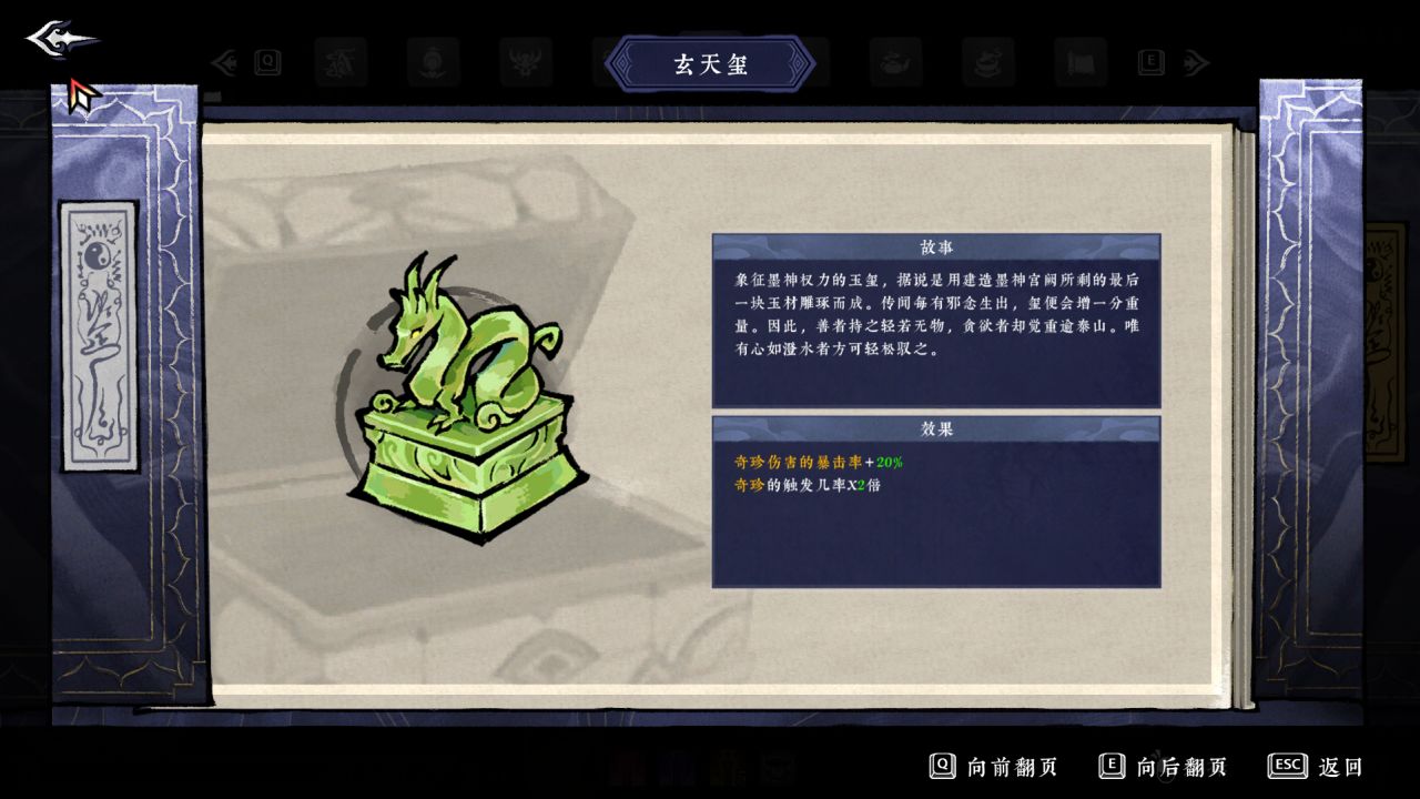例如前文提到的麒麟墨,就有与之完美适配的传说物品:玄天玺。直白易懂的奇珍伤害暴率,与此前没有出现过的(特殊效果)触发几率翻倍相结合,简直是如虎添翼。