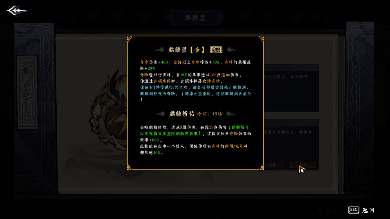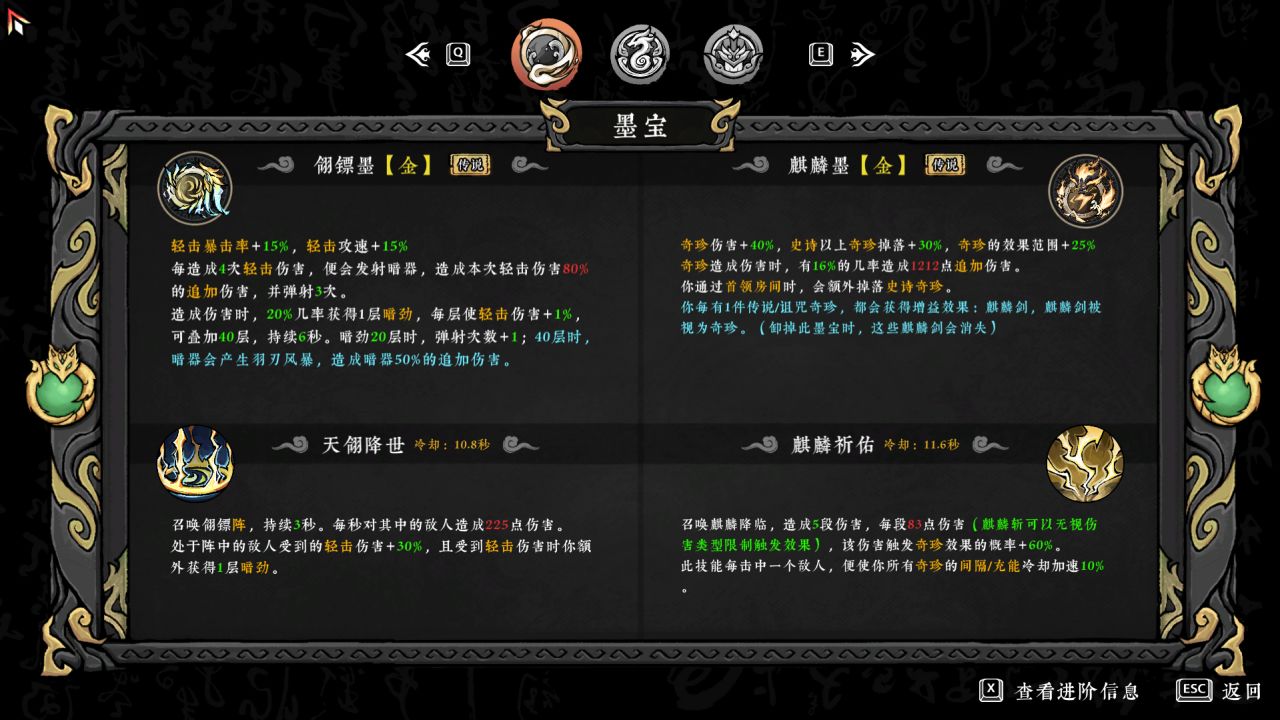 墨宝方面,我只体验了能够增强奇珍效果的麒麟墨。它与轻击流必不可少的青龙墨,有着异曲同工之妙:二者在将等级升满后,都会多出一个在我看来,效果极其显著的强力被动。