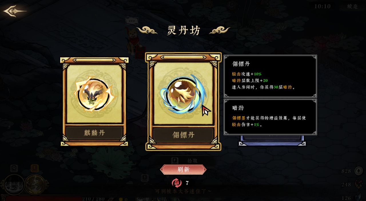 制作组在深思熟虑后,给出了一个不错的解法:根据玩家携带墨宝的五行属性,给予相对应的丹药。倘若两手空空,则提供通用丹药。