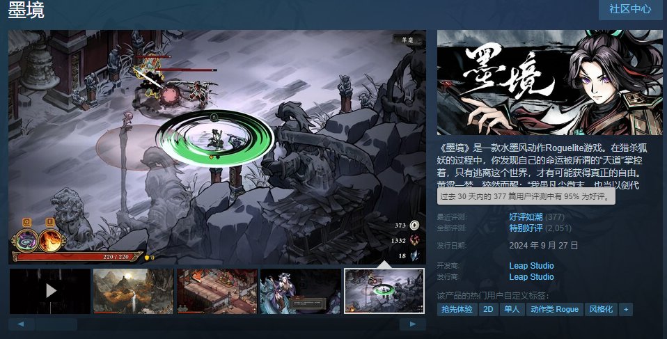 在国产动作肉鸽游戏《墨境》中,你可以体验到:普攻附带多段连击,且出手速度比我对象翻脸都快(这条可不能让她看到)、一刀暴击BOSS原地升天(27万是敌人血条的极限,但不是我的)、发育一整把的异常DOT流五巴掌被头目拍死,道心破碎直接关机睡觉(感觉不如...)。