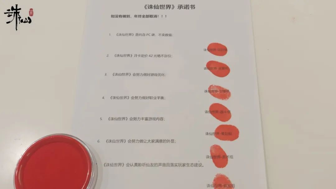 但公测前一天,关于游戏最出圈、传播度最高,也最吸引眼球的宣发,还是那张项目组轮流按红手印的“官方承诺书”:
