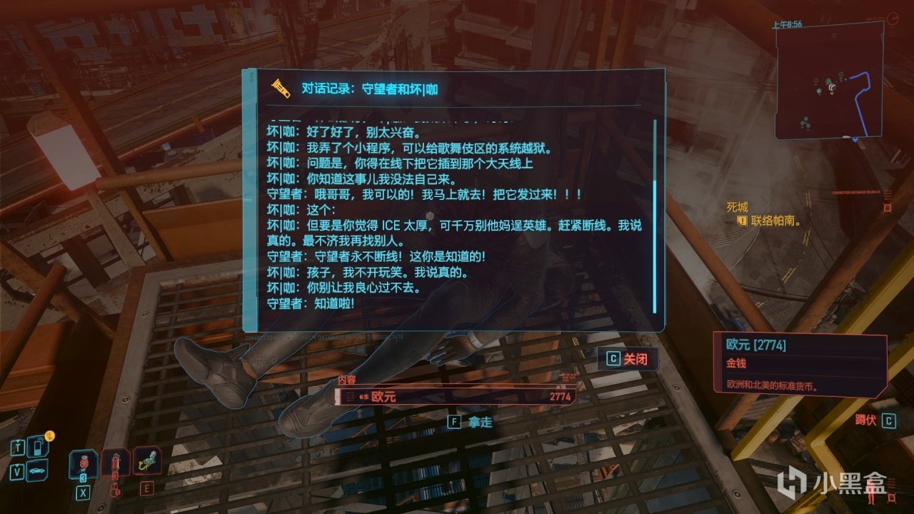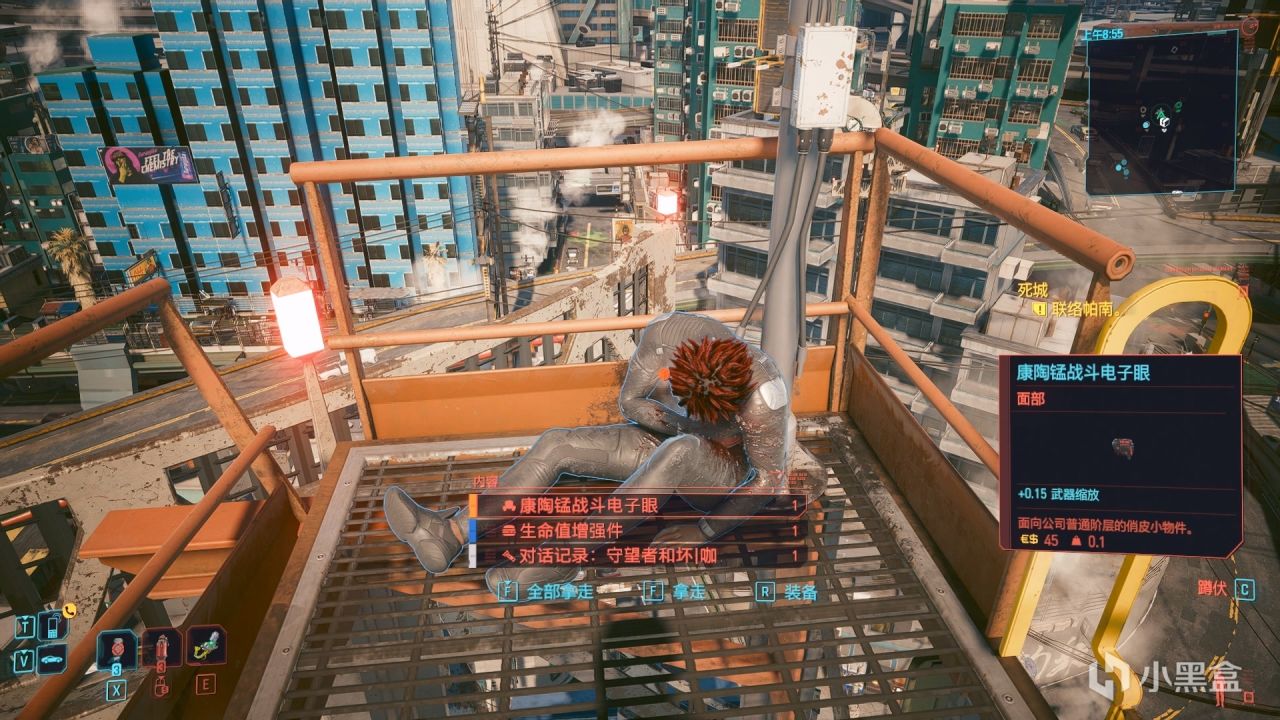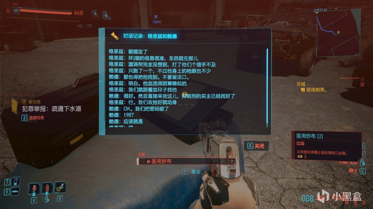 他的尸体旁有一个荒坂公司的箱子,里面是一条通话信息和一把武器,我个人猜测这个雷伊很可能是荒坂公司的人。那么结合任务“调虎离山“,坏咖帮助漩涡帮,很可能也是为了打击荒坂。