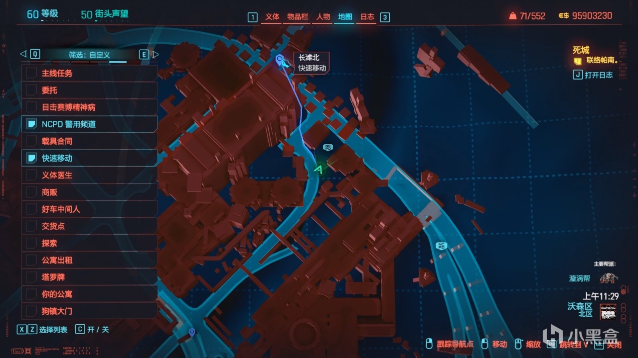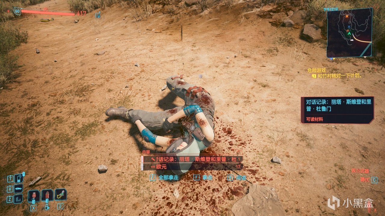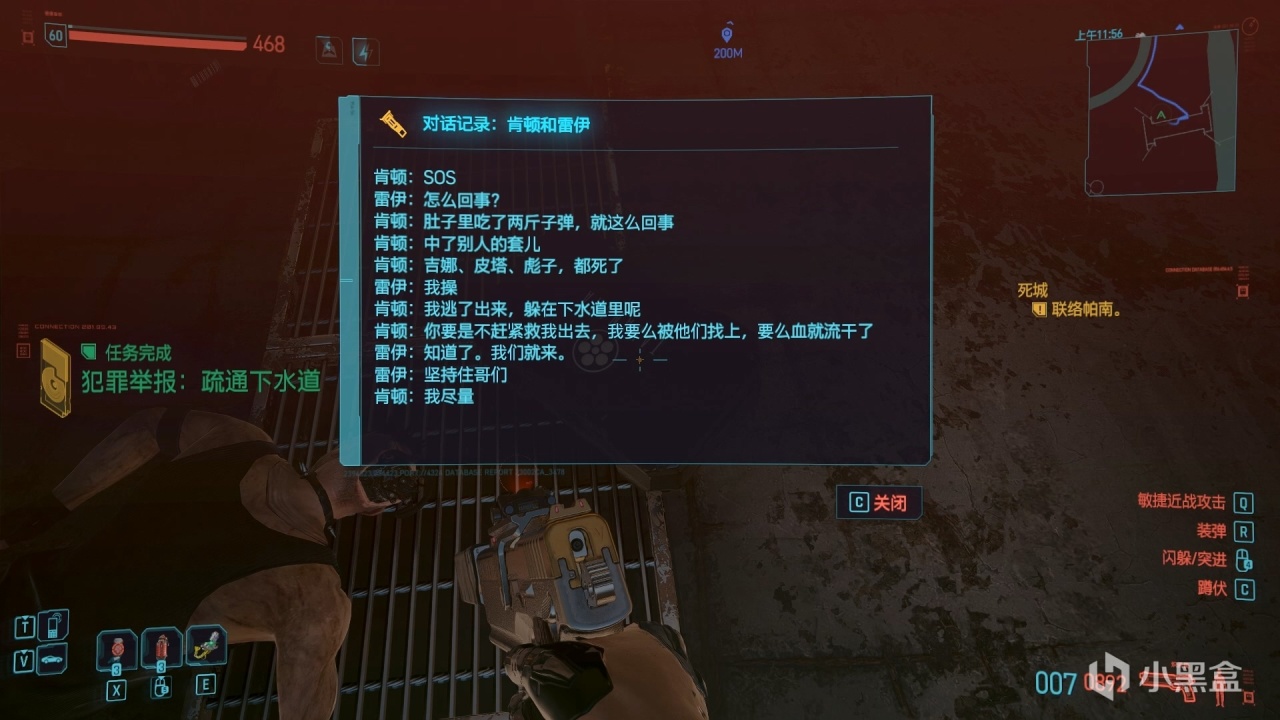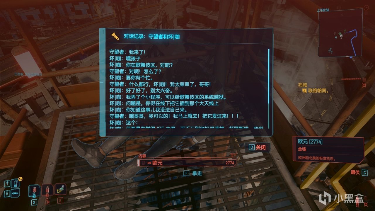 他的尸体旁有一个荒坂公司的箱子,里面是一条通话信息和一把武器,我个人猜测这个雷伊很可能是荒坂公司的人。那么结合任务“调虎离山“,坏咖帮助漩涡帮,很可能也是为了打击荒坂。