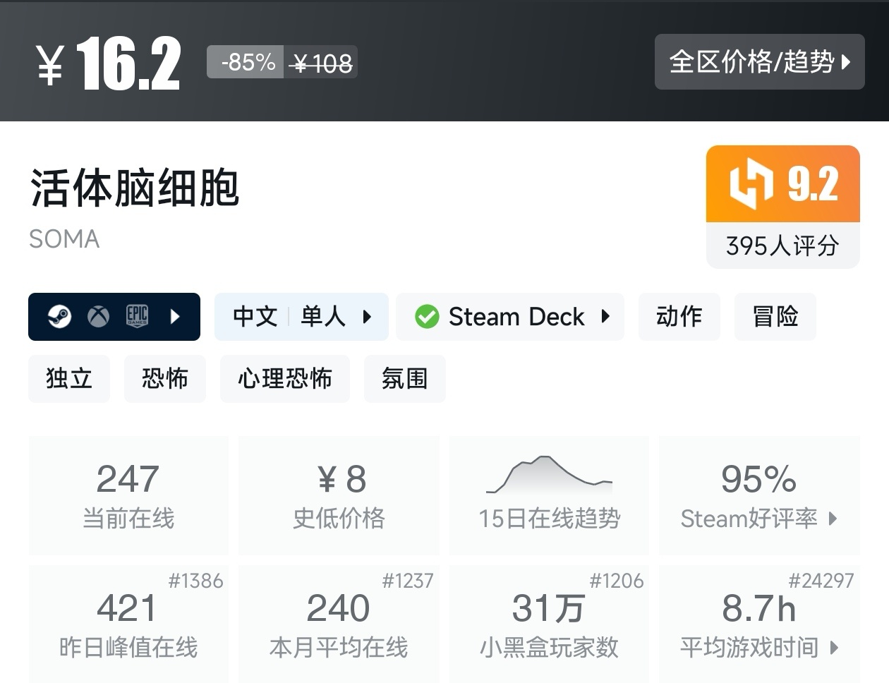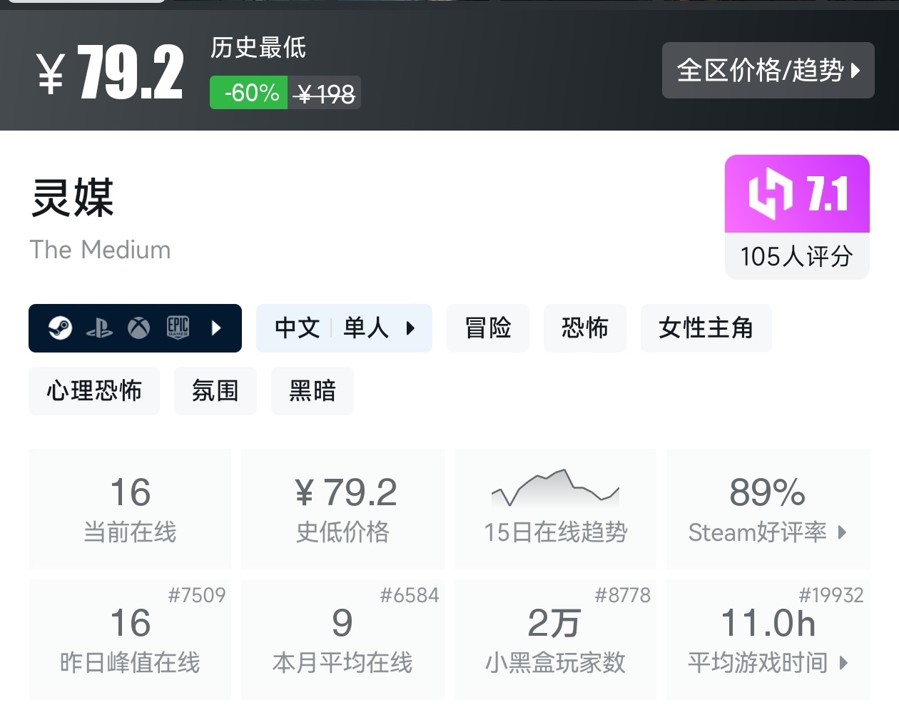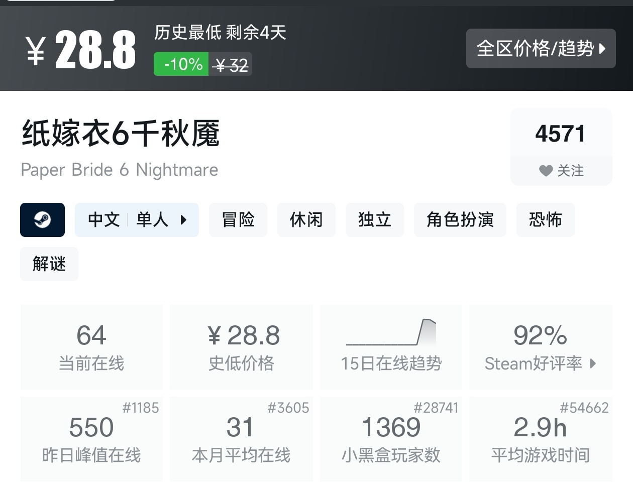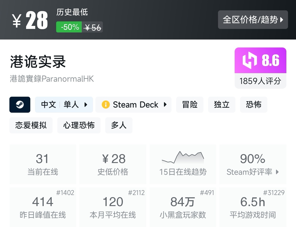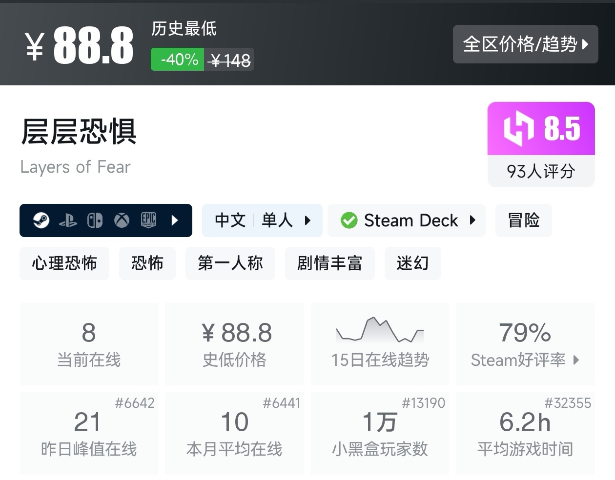 大家好,继几种类型的游戏折扣汇总后,我们来到了恐怖游戏,如果说哪种类型的游戏带给人的情绪波动最明显,那无疑是恐怖游戏了,让你害怕是实实在在的,但是爱玩也是真的,又怕又喜欢,希望我的汇总,能够帮助到各位盒友挑选心仪的游戏。