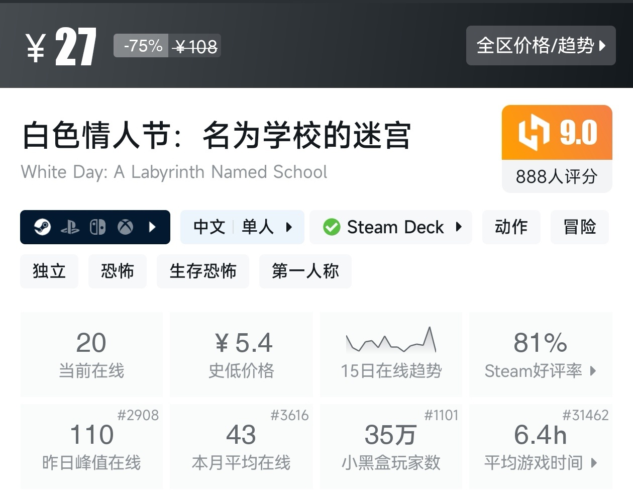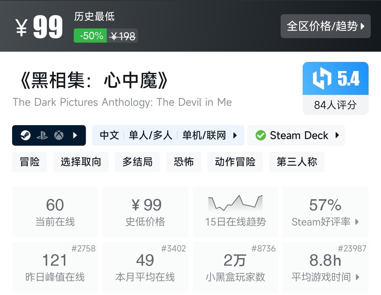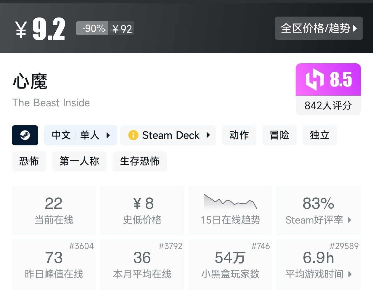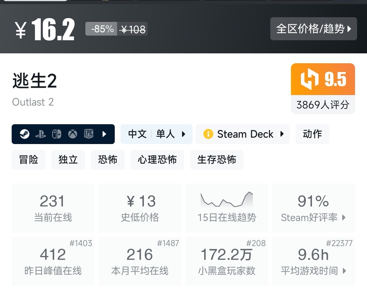 大家好,继几种类型的游戏折扣汇总后,我们来到了恐怖游戏,如果说哪种类型的游戏带给人的情绪波动最明显,那无疑是恐怖游戏了,让你害怕是实实在在的,但是爱玩也是真的,又怕又喜欢,希望我的汇总,能够帮助到各位盒友挑选心仪的游戏。