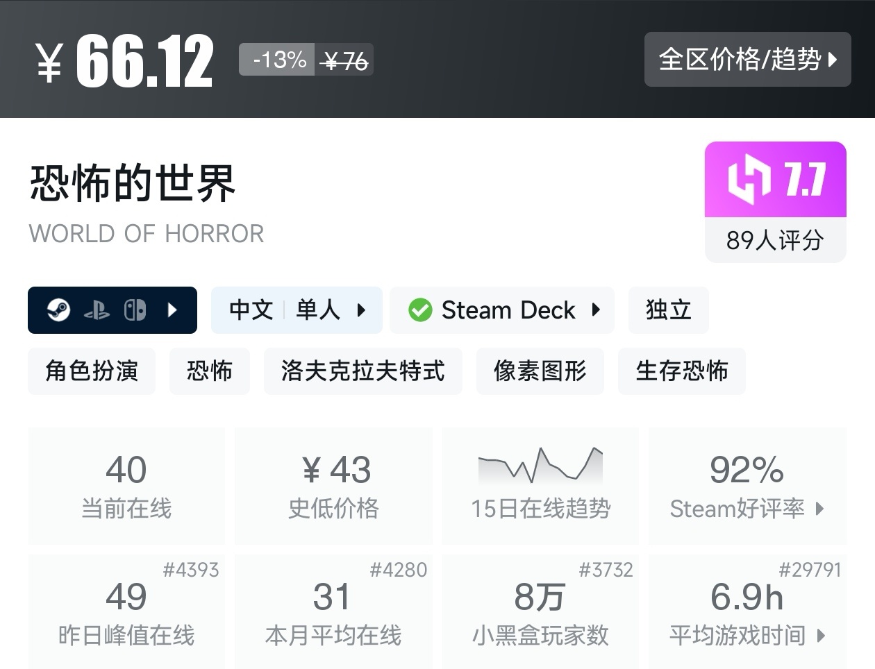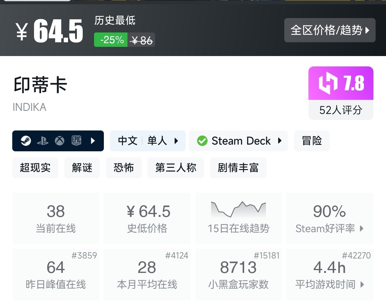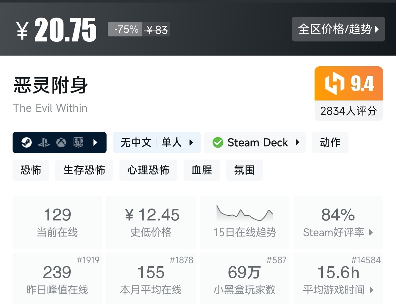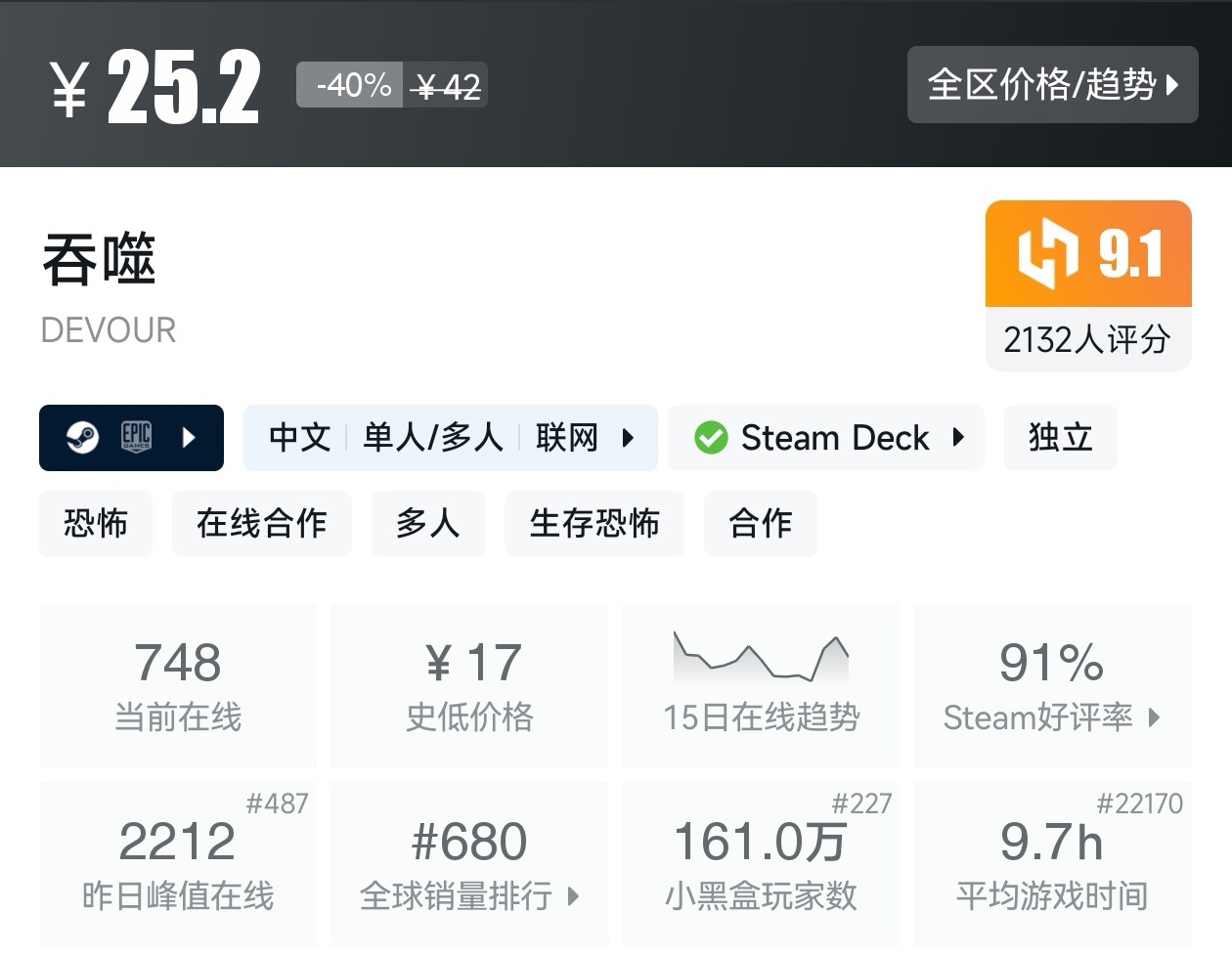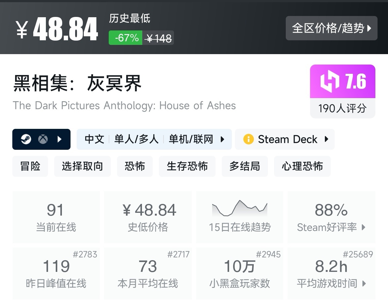 大家好,继几种类型的游戏折扣汇总后,我们来到了恐怖游戏,如果说哪种类型的游戏带给人的情绪波动最明显,那无疑是恐怖游戏了,让你害怕是实实在在的,但是爱玩也是真的,又怕又喜欢,希望我的汇总,能够帮助到各位盒友挑选心仪的游戏。