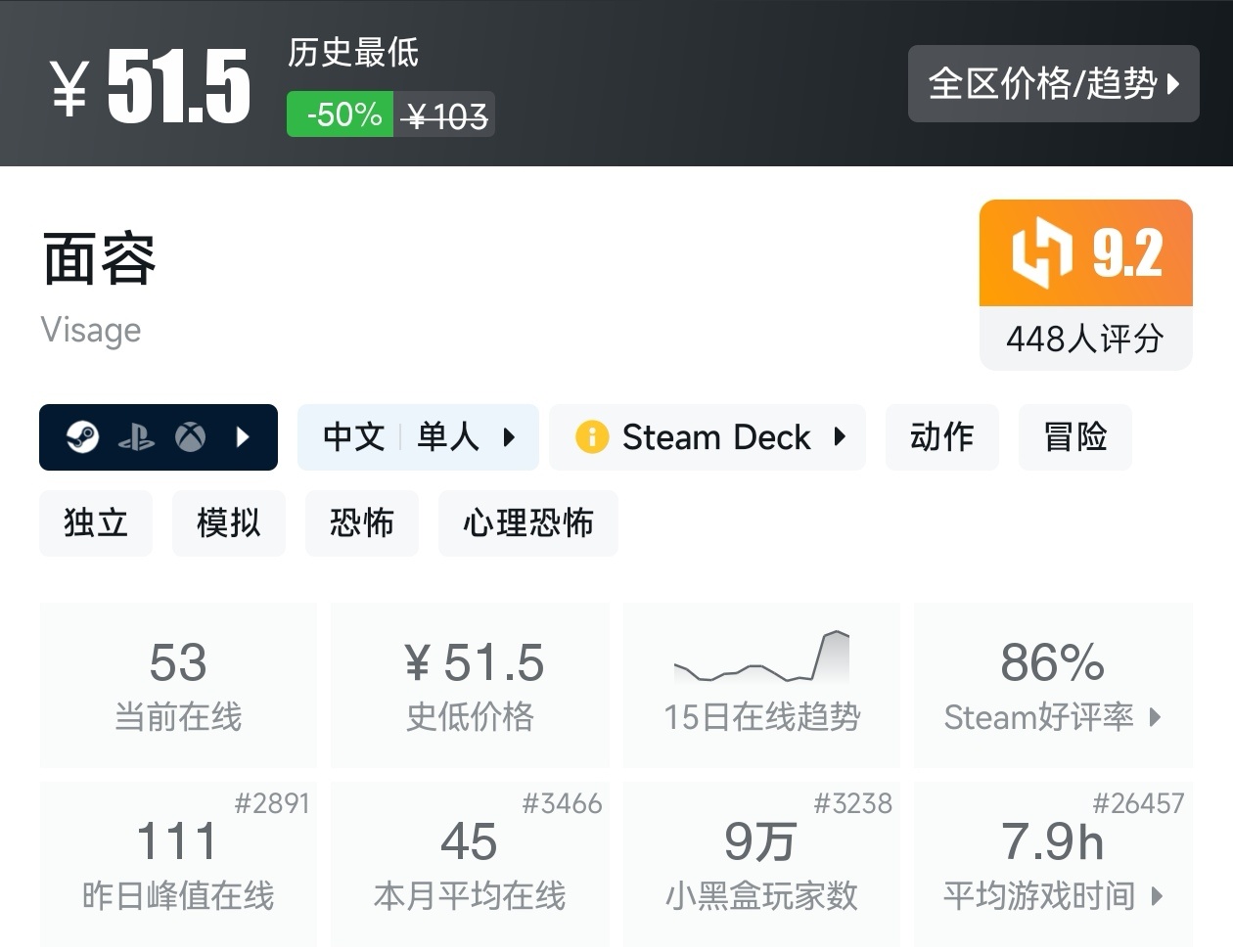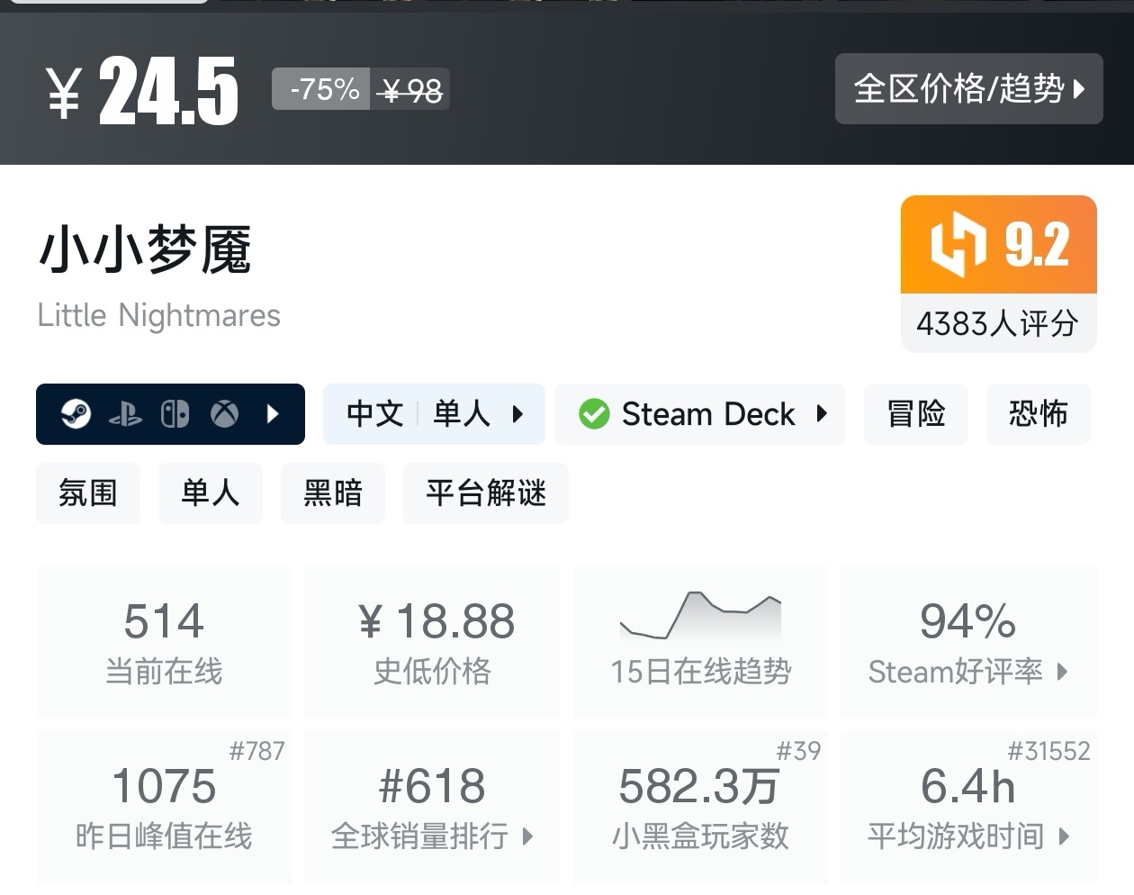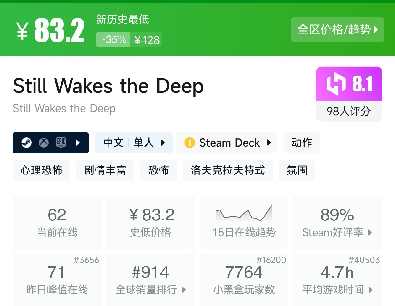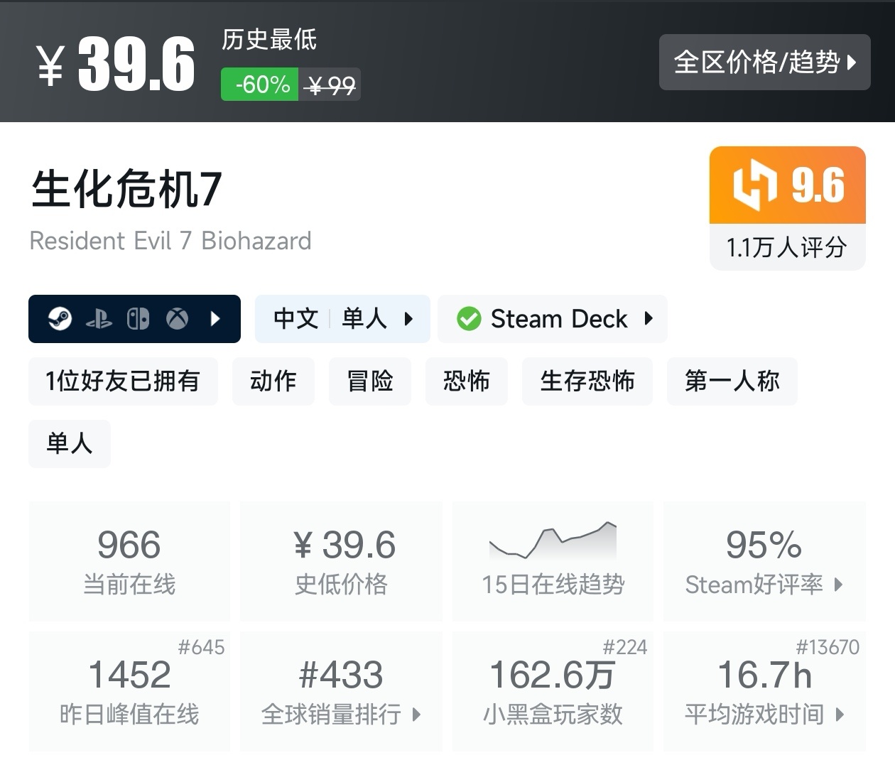 大家好,继几种类型的游戏折扣汇总后,我们来到了恐怖游戏,如果说哪种类型的游戏带给人的情绪波动最明显,那无疑是恐怖游戏了,让你害怕是实实在在的,但是爱玩也是真的,又怕又喜欢,希望我的汇总,能够帮助到各位盒友挑选心仪的游戏。
