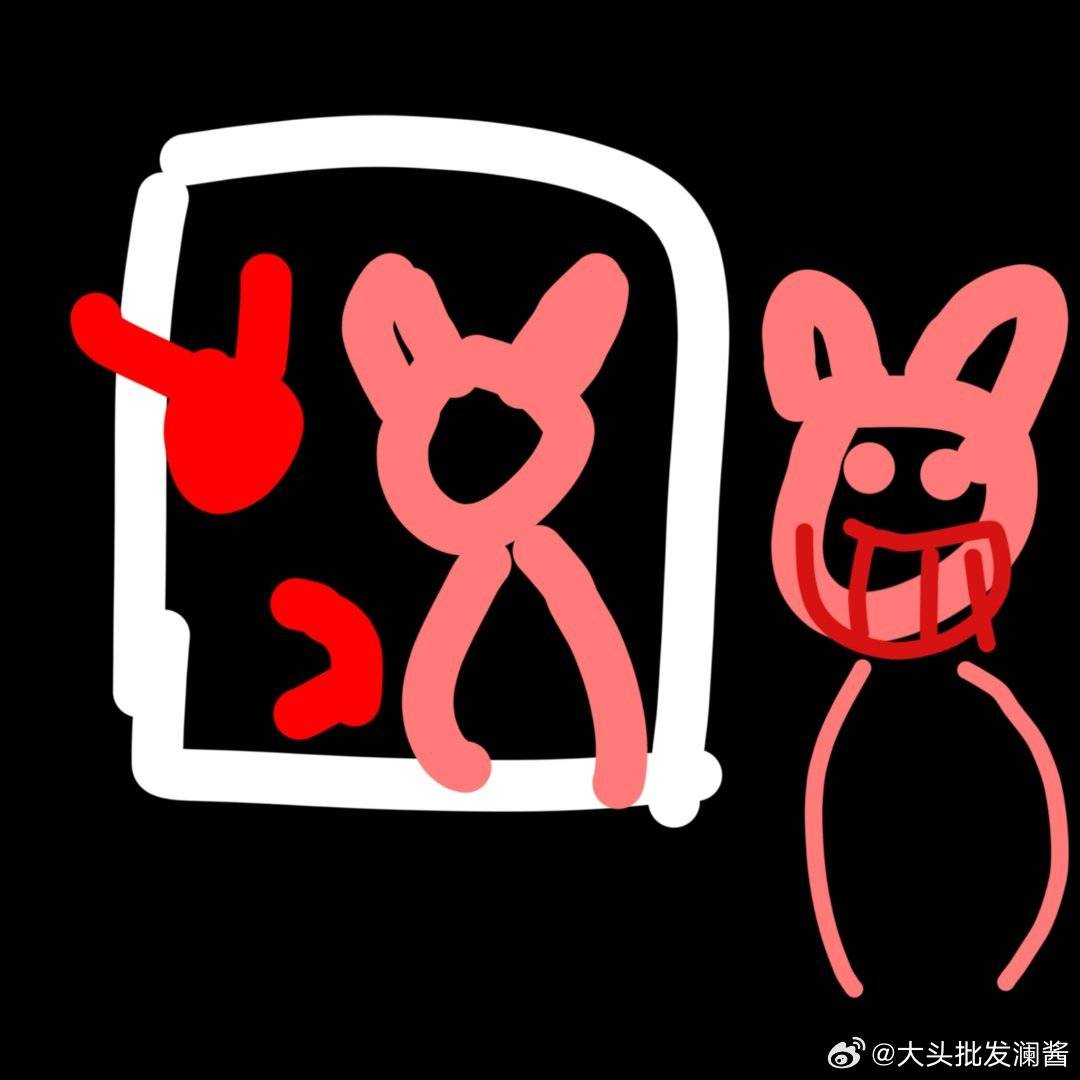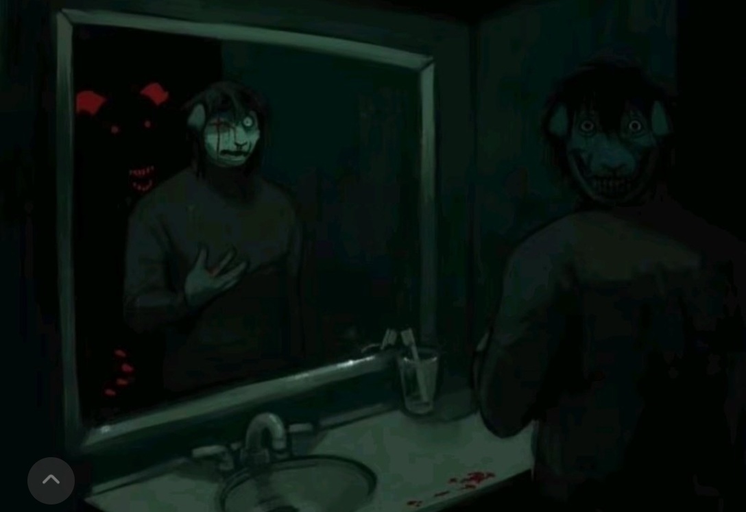 白框是镜子,一个有狗耳朵的人站在阴暗处照镜子,镜子映出狗耳朵的人(少一个眼睛),狗耳朵人旁边有一个咧嘴笑的脸(不恐怖有点萌),再往旁边一看,狗耳朵人后脑勺出现一个狗耳朵人的脸,两个眼睛直勾勾的跟咧嘴笑(他咧嘴像咧嘴女那样)看着你