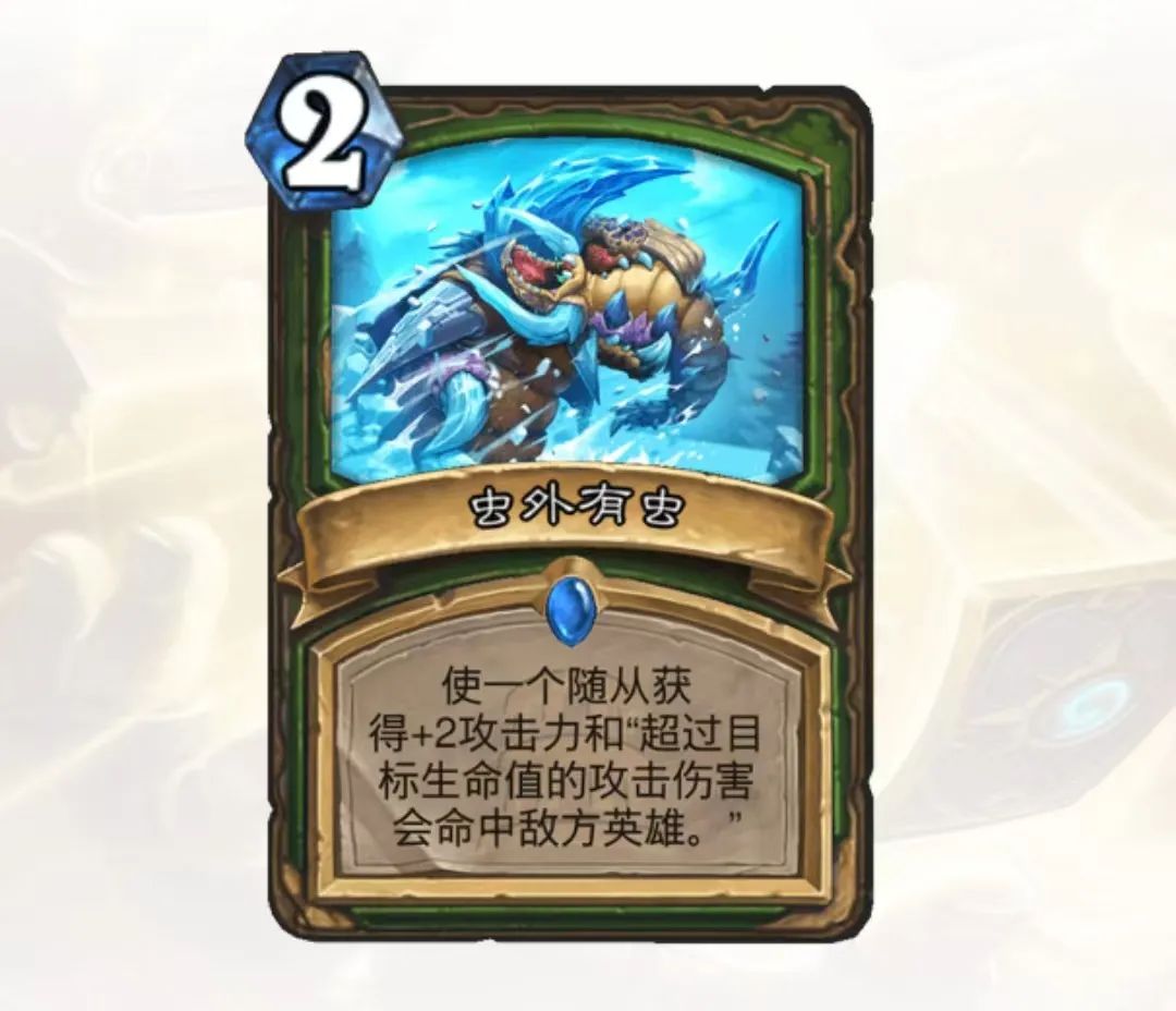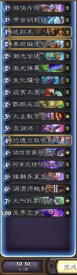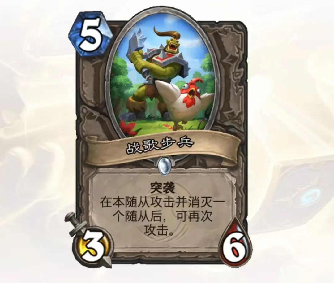 核心是战歌步兵+预留泊位+虫外虫,围绕法术控场、buff步兵,最后贴虫斩杀,战歌步兵的机制是杀死随从可以再次进攻,因此buff过的步兵可以反复超杀。思路比较简单暴力,早点上奈丽把技能换成追踪术去发现,用法术和奥秘来控场的同时不停buff步兵。斩杀阶段算好斩杀线,是buff多次的步兵+虫外有虫用过量伤害打脸斩杀。