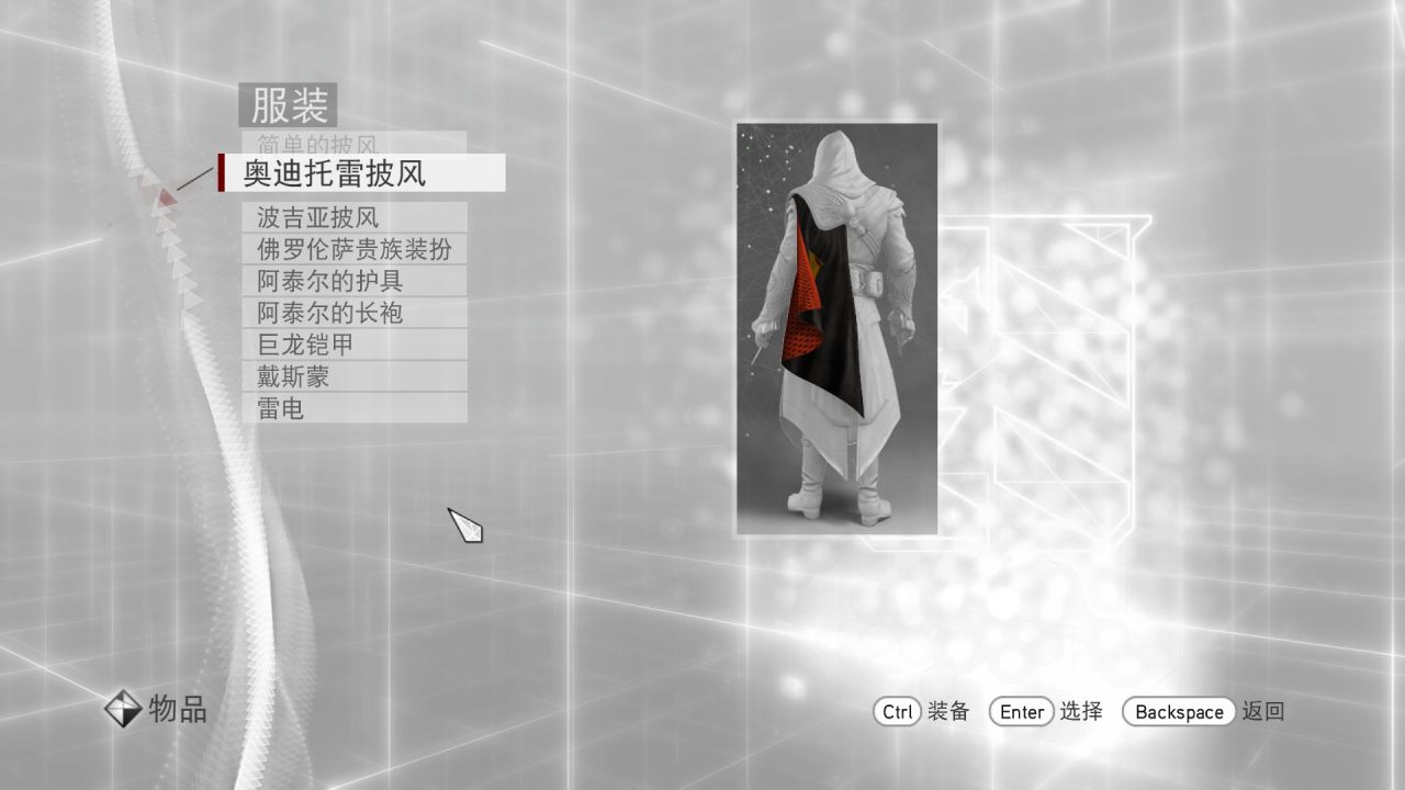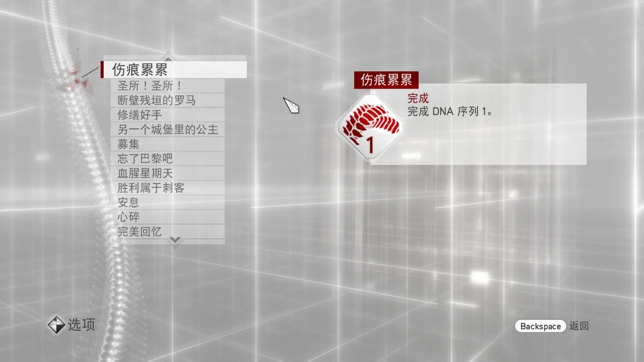 游戏中的服装是在“Esc”–“物品”–“服装”里的,如果你替换完了文件以后发现大部分服装都有,除了需要完成某些序列或者完成全部虚拟模拟才能获得的服装以外,那就说明替换成功了,而uplay的成就系统,在“Esc”–“选项”–“状态”–“成就”(在最下面)里,但是有时候也会卡bug,有些成就怎么也完不成,有的成就明明完成了却不显示,好像还有一些成就需要联机才能完成等等各种恶心问题,反正即使没有完成这些成就,最后“整体”依然能达到100%同步。