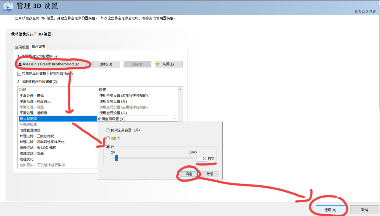 然后下面设置一栏里找到“最大帧速率”,“使用全面设置(默认为关)”修改为“开”,再把帧率最大值设置为“60”即可,记得点“确定”然后再退出N卡控制面板之前,点右下角的“应用”。