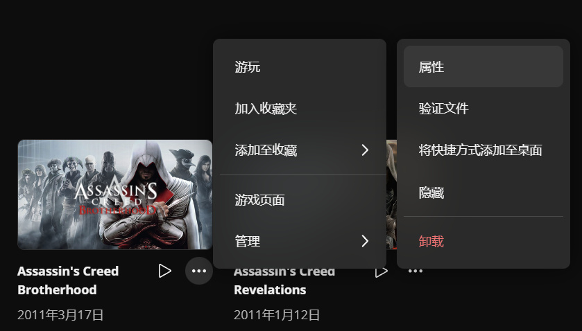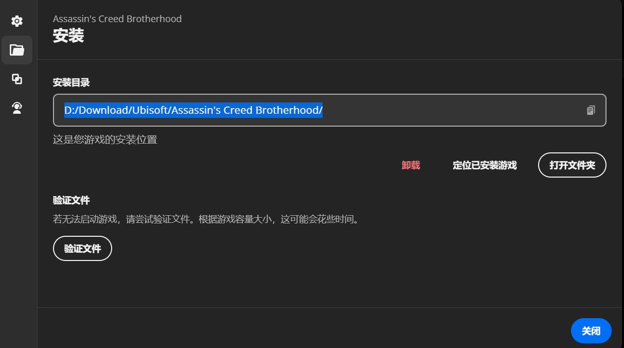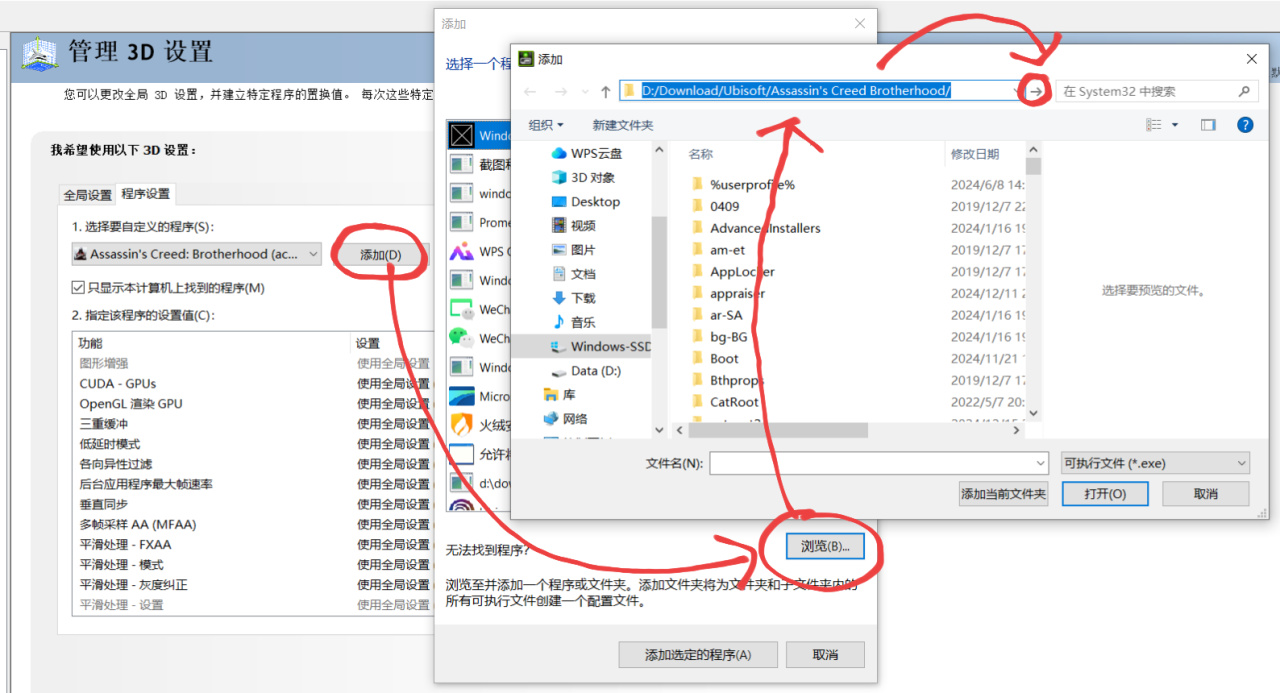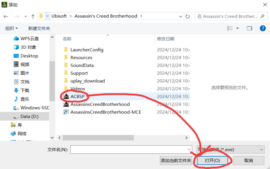 ——————————————————————————如果你之前没运行过兄弟会/启示录,或者实在找不到这个程序在哪,就去游戏平台中找到该游戏储存文件的位置(还是以育碧为例,steam玩家都知道游戏储存的文件在哪吧,这里不多说了),游戏图标右下角“三个点”–“管理”–“属性”–“文件夹图标”,再“Ctrl➕C”复制地址,然后再在刚才的“添加”下面找到“浏览”,在最上面把刚才复制的文件地址“Ctrl➕V”再粘贴进去跳转,然后选择“ACBSP”打开即可。