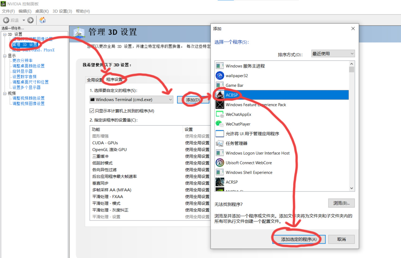 然后打开以后在左边一栏里找到“管理3D设置”,选择“程序设置”,在“选择要自定义的程序”里面找到“Assassin's Creed: Brotherhood (acbsp.exe)”,如果没有找到,就点右边的“添加”,只要你最近运行过兄弟会,基本都能在“最近使用”的排序下找到它“ACBSP”,注意程序后缀是“(acbsp.exe)”的才是对的,这个SP是单人模式的意思,如果你玩的是“刺客信条启示录”,同样在“添加”里就找“ACRSP”,选择后游戏程序后缀同样为“(acrsp.exe)”的才是正确的程序,而不是!而不是(acrmp/acrpr.exe)!因为兄弟会/启示录的多人模式早就关闭服务器了,所以那两个程序相当于没用了,只剩单人模式能玩了。