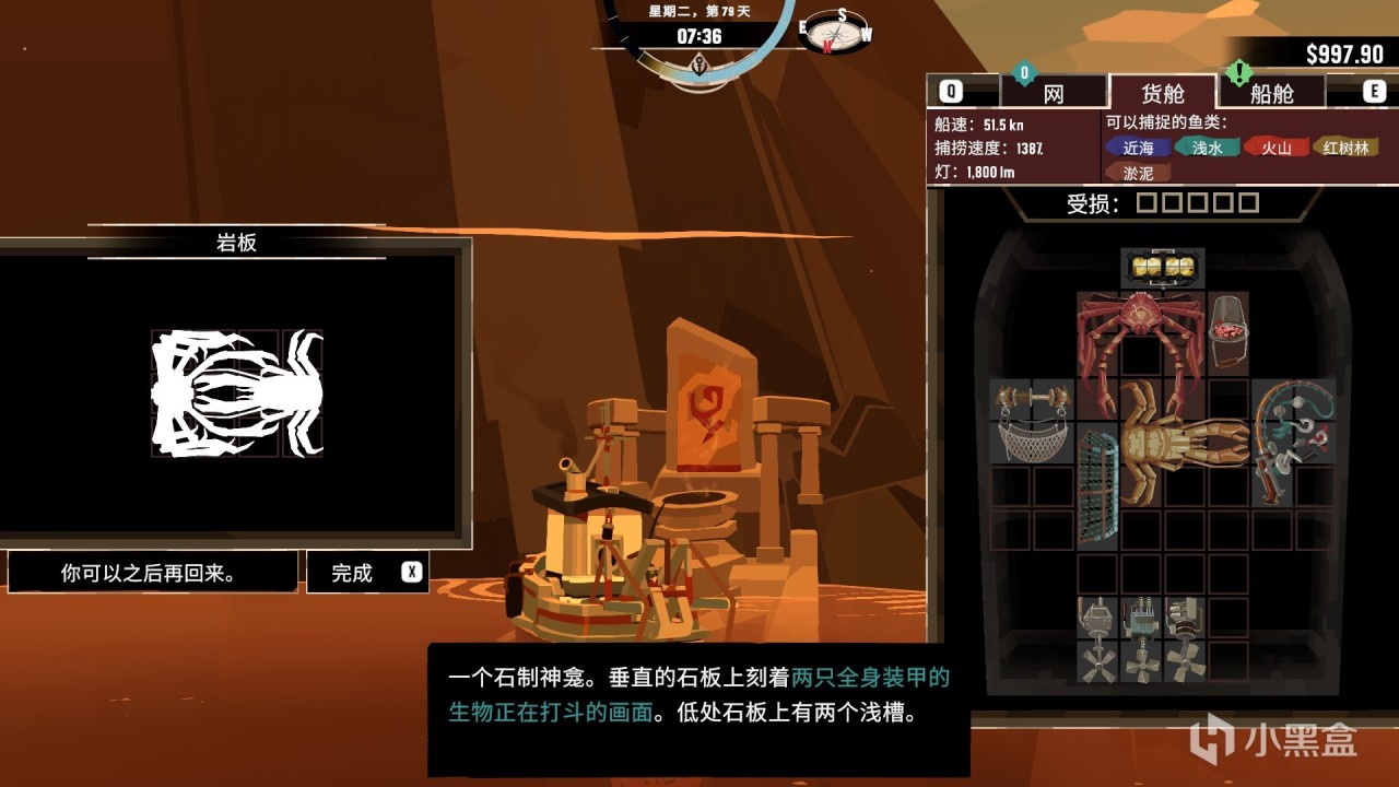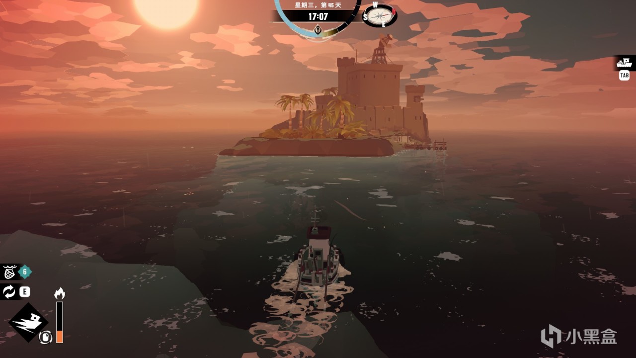 另一方面,游戏中时间流速很快,每次下竿和移动到新的鱼群都需要耗费时间,尤其是在航行速度较慢的情况下,没钓多久天色就暗下来了,而镇长一早就告诫过我们要在天黑前返航。贴心的是,时间仅仅在航行和下竿时流动,这意味着玩家有充足的时间思考如何优化存储空间,以及接下来该往哪走该干什么。
