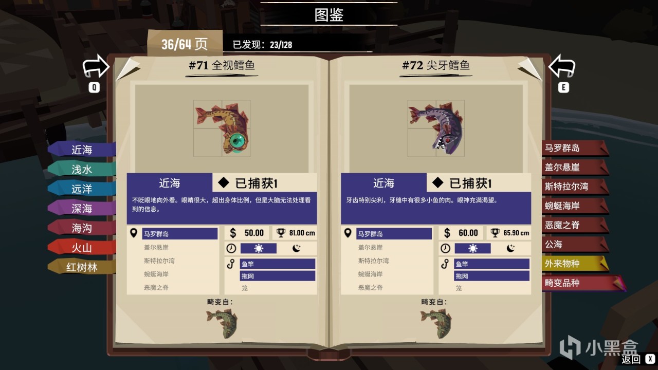 但是我不得不面对这些,且不说只在夜晚才能捕捉到的鱼类,没有人能抵挡泛着绿光的鱼群中畸变鱼的诱惑。在黑暗侵蚀下发生异变的鱼类拥有独特的艺术美感,是我的鱼类图鉴中不可或缺的存在。瞧瞧这全视鳕鱼,偌大的绿宝石般明艳的眼睛,饱满的橙红色身躯,多么可爱迷人。