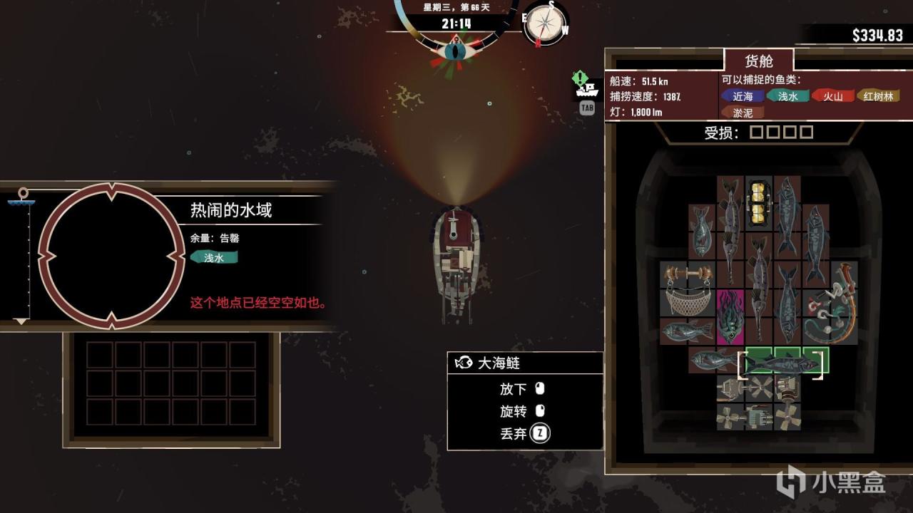 钓鱼的过程很简单,却不是想钓多少就钓多少。一方面,渔船的位置有限,玩家需要通过旋转物品把它们以合适的形状安排在合适的位置,尽可能装下更多战利品。这有点像拼图或者俄罗斯方块,不过一时无法塞下新物品也没关系,每次有新收获都可以通过一块空白存储区域进行周转,调整船上现有的物品和新增物品。