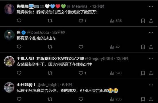 评论区的玩家们也纷纷说起反话,并未揭露游戏已经停服暴死的事实。“恭喜你玩到2024年度最佳游戏”、“听说销量高达百万份”、“可以加你PSN好友吗,一起玩”、“记得安装最新补丁哈”...当然,推主很可能是故意装作不知情,评论区在配合他一起演戏嘲讽《星鸣特攻》。
