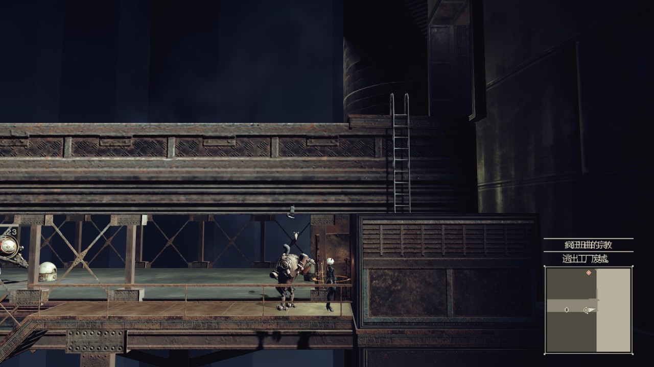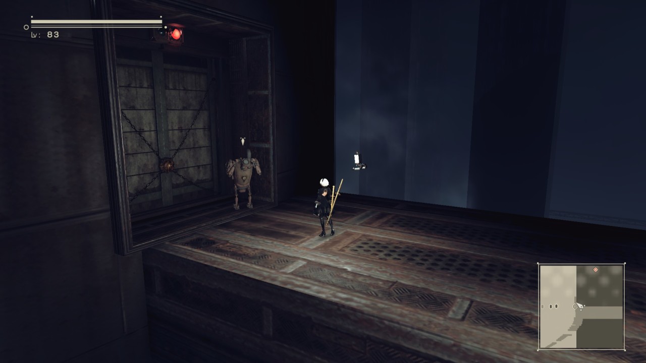 3周目的时候操作9S返回废弃工厂的地下区域,一直向前走知道通过一个传送带,爬上梯子来到如图所示的位置。然后向左走,打开一个锁着的的门,里面有武器同时还有敌人。