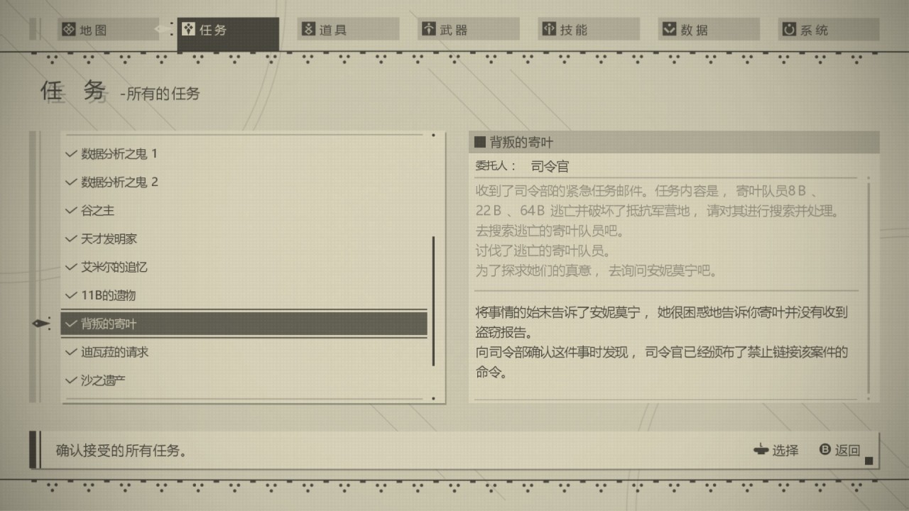 1.外星船只事件之后在邮箱里接受「叛变的队员」任务,前往都市废墟与22B、64B战斗。