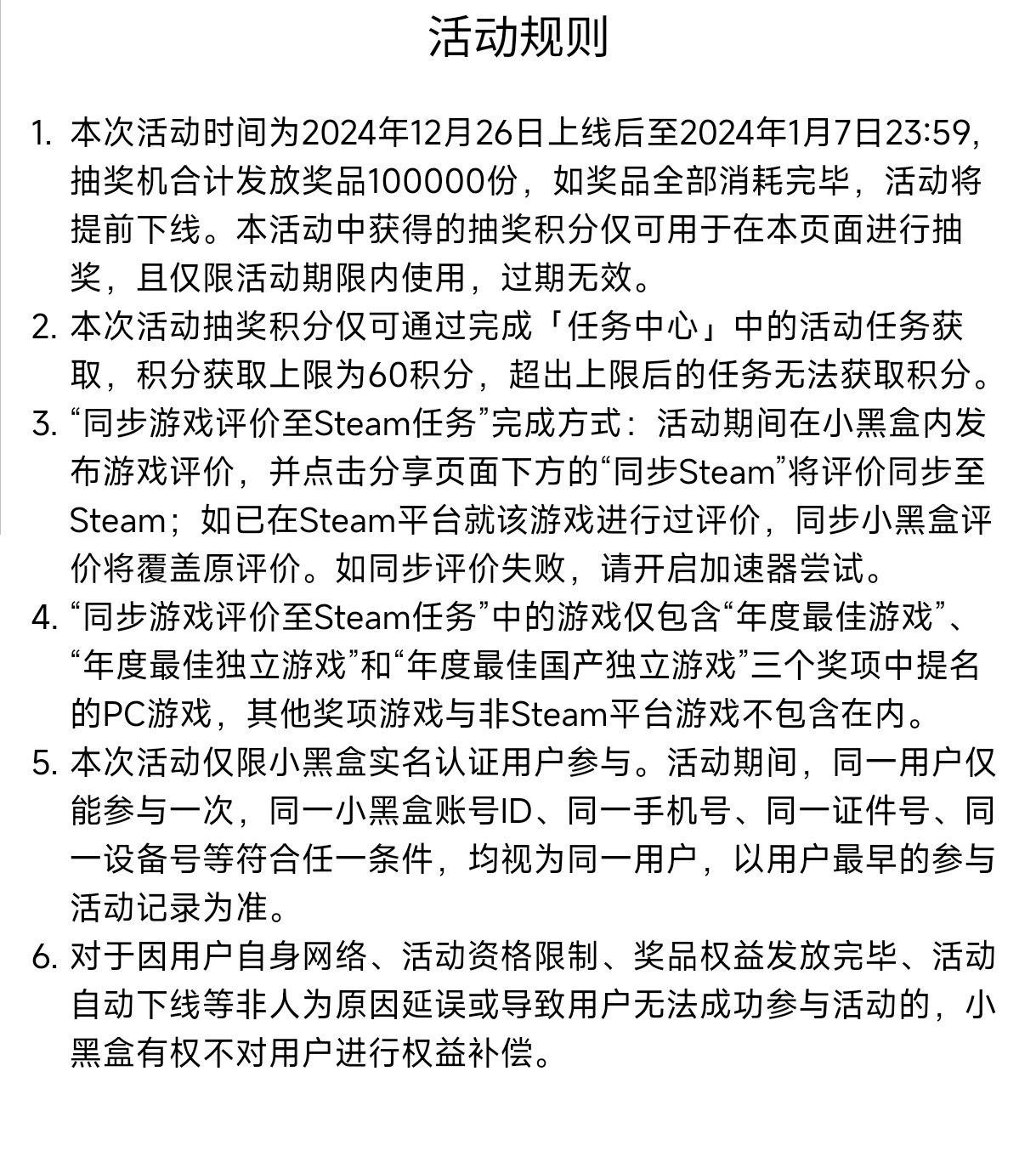~本次活动仅限小黑盒实名认证用户参与。活动期间,同一用户仅能参与一次,同一小黑盒账号ID、同一手机号、同一证件号、同一设备号等符合任一条件,均视为同一用户,以用户最早的参与活动记录为准。
