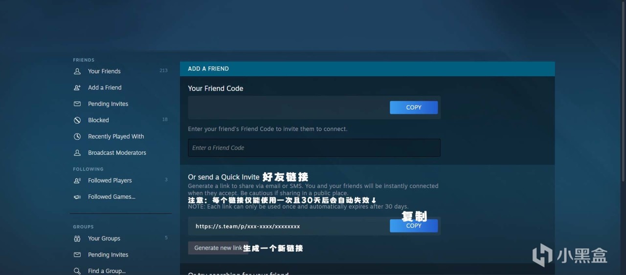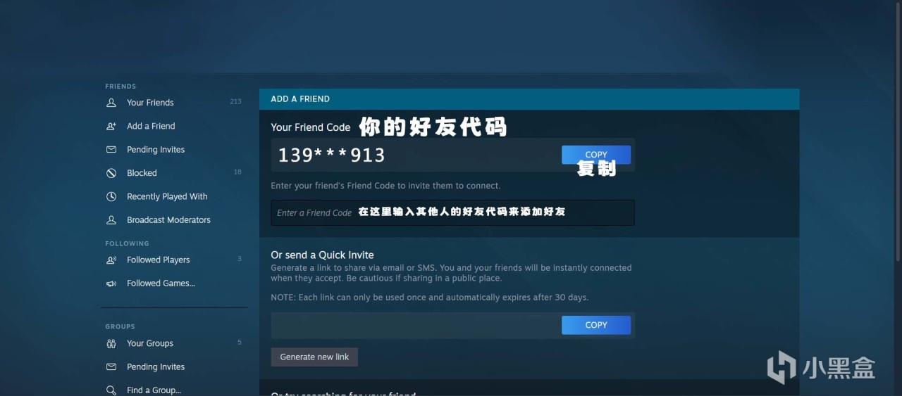 意思就是你的账号得消费超过5美元(国区好像是36块还是多少来着?)才能成为正式账号,自动获得添加好友的权限。然后在这里点击进入添加好友界面。