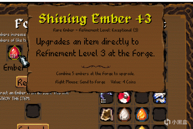 如下图,这是一颗让装备变为”精炼等级1“的1级余烬,这是从它的物品介绍(图中红框)里看出来的。
