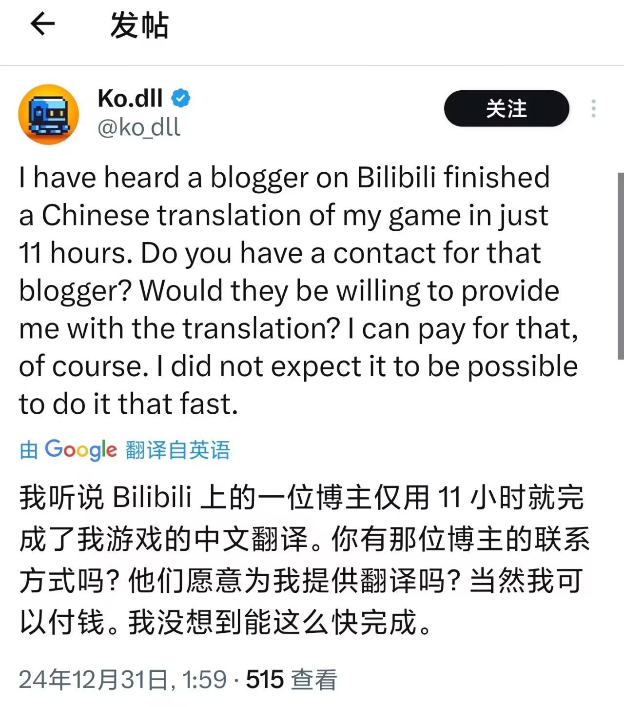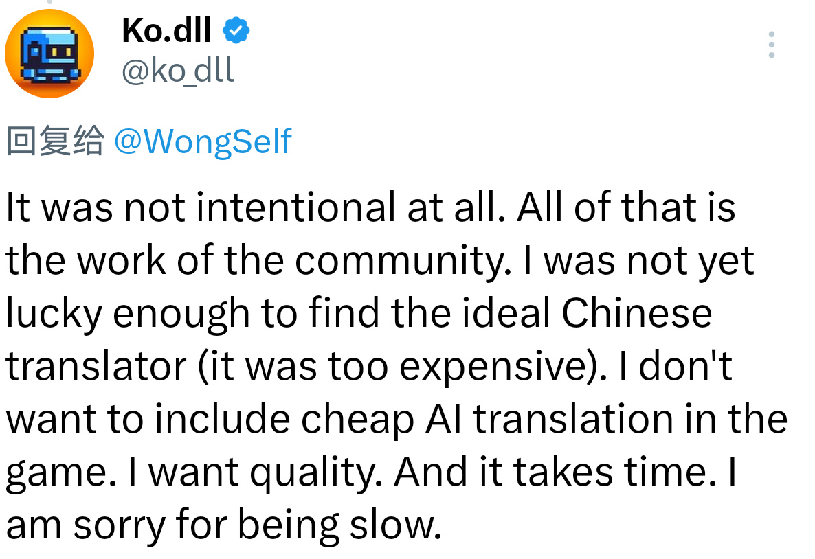 作者在推上一直表明翻译需要很多钱,还有很多时间,按照他的说法,翻译一个语言需要花费1500刀,还需要本人自费,并且他一直说自己没有找到合适的翻译,他不想通过机翻