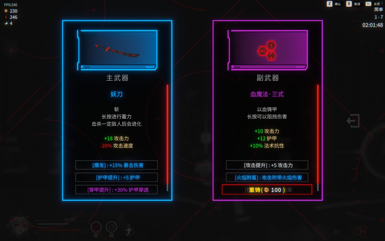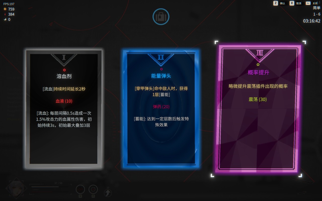 如果选择获得卡牌的话,会随机给我们刷新三张不同的卡牌供我们选择。某些卡牌是对应固定的武器体系的,例如法术或者物理攻击,而大部分的卡牌都是无论玩什么都可以选择的。搭配好合适的卡牌可以大大提升我们的实力。